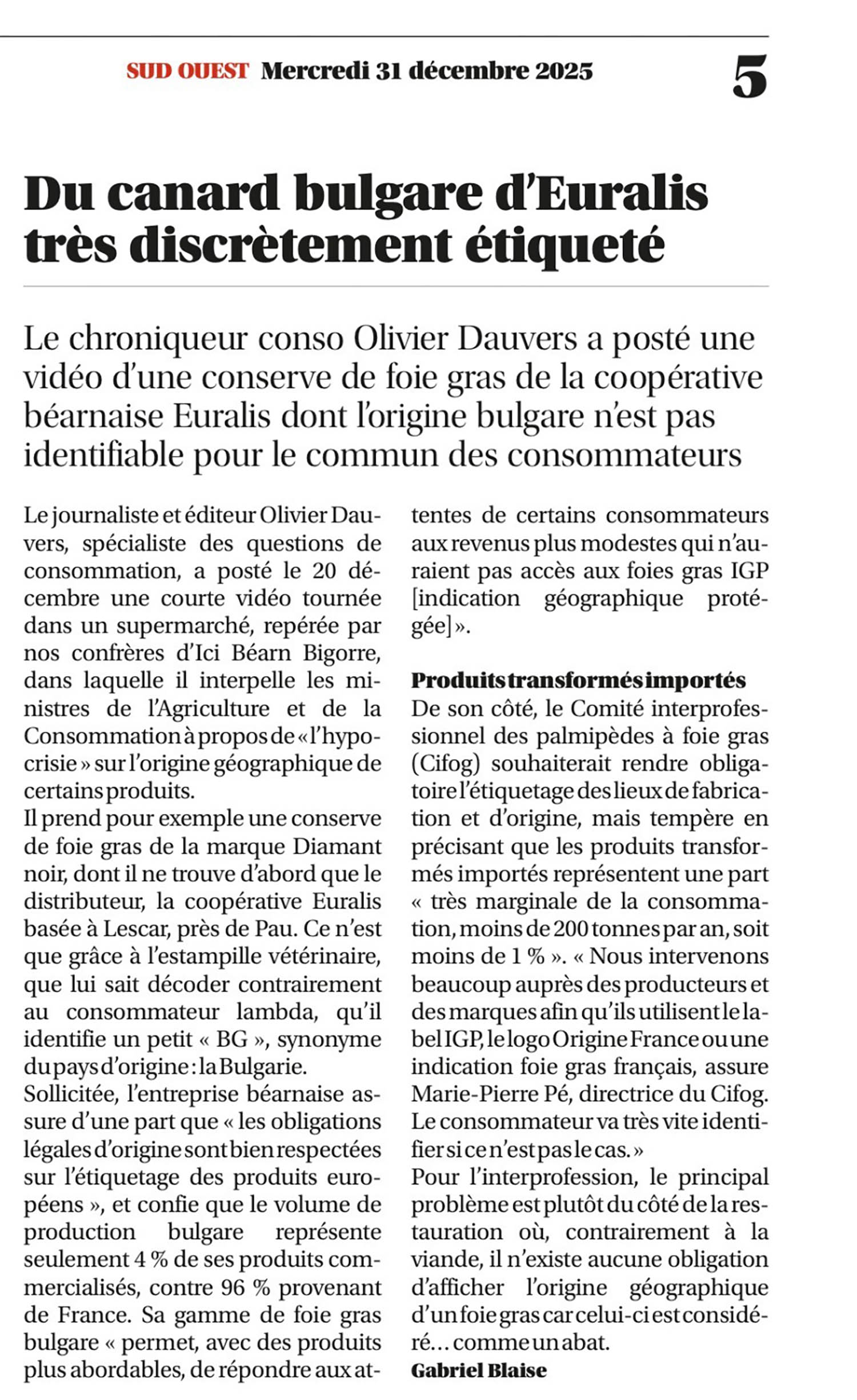 Mes oreilles sifflent 🤣. Paraît qu’à Pau (siège de la coopérative Euralis) mieux vaut ne pas dire qu’on me connaît… En cause : une vidéo “Toc toc” publiée il y a quelques jours (revoir ici) dans laquelle je dénonçais l’anonymat d’un foie gras bulgare vendu (chez Auchan) par ladite coopérative du Sud-Ouest. Plus d’un demi-million de vues plus tard sur mes réseaux, l’info est reprise par la radio locale Ici Béarn puis par le quotidien Sud-Ouest, forçant Euralis à se justifier.
