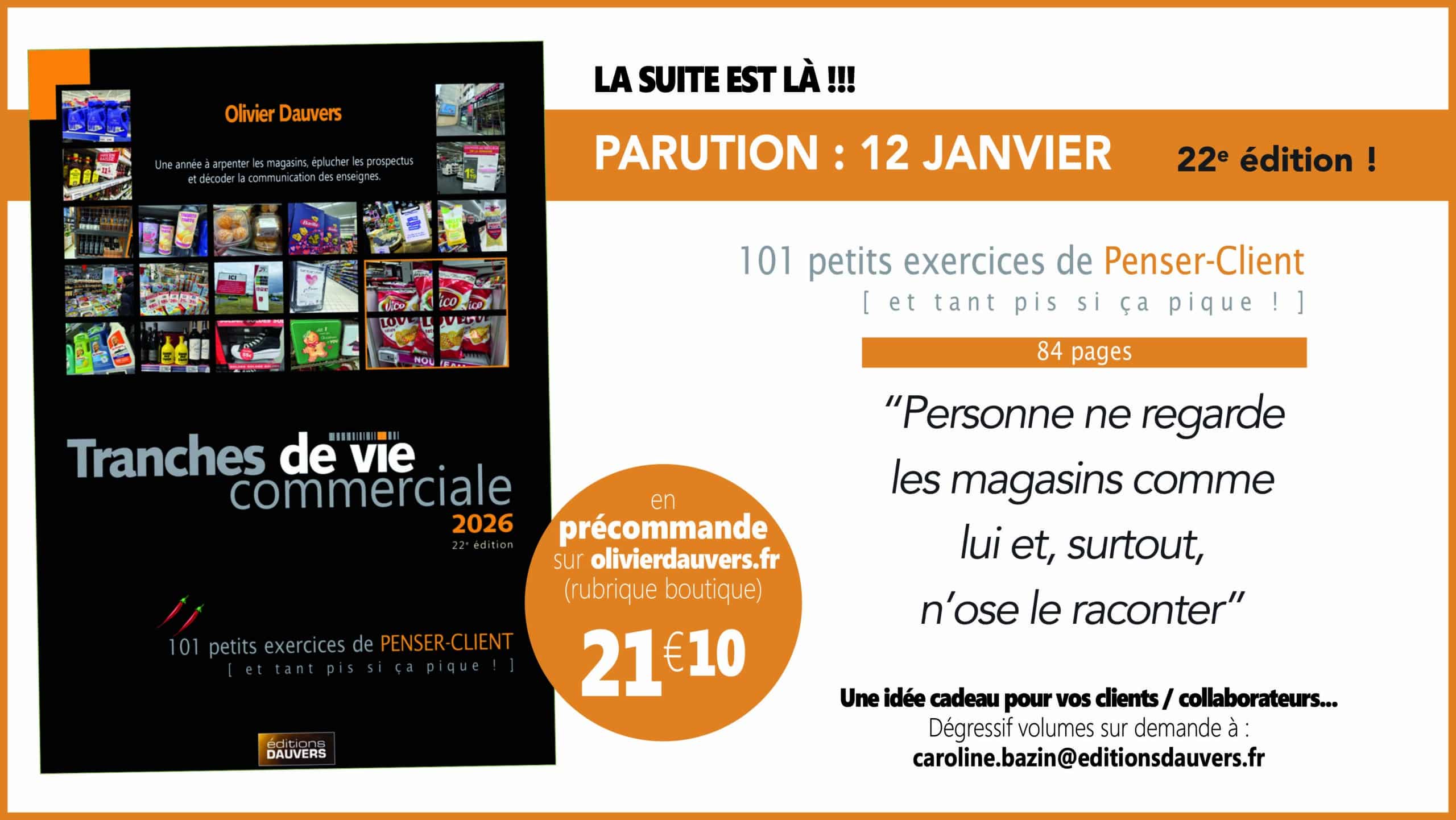 Solide tradition (depuis 22 ans), janvier est le mois de publication de mon opus annuel de “Tranches de vie commerciale”. Une annĂ©e Ă arpenter les magasins et… Ă le raconter. Librement et toujours avec une posture de client (avec l’image qui va avec parce que ça en devient incontestable !). Ce qui en fait autant de petits exercices de PENSER-CLIENT.