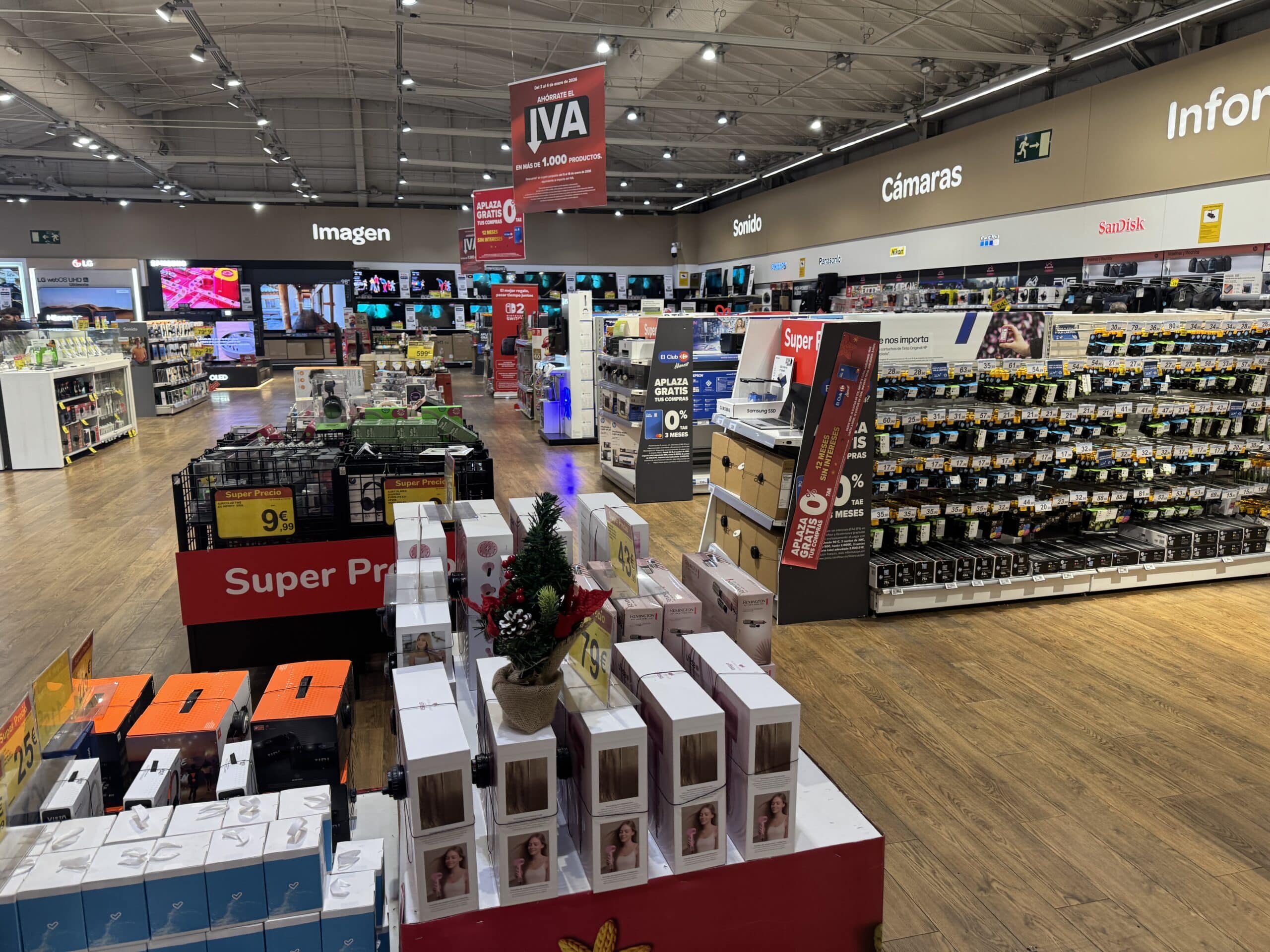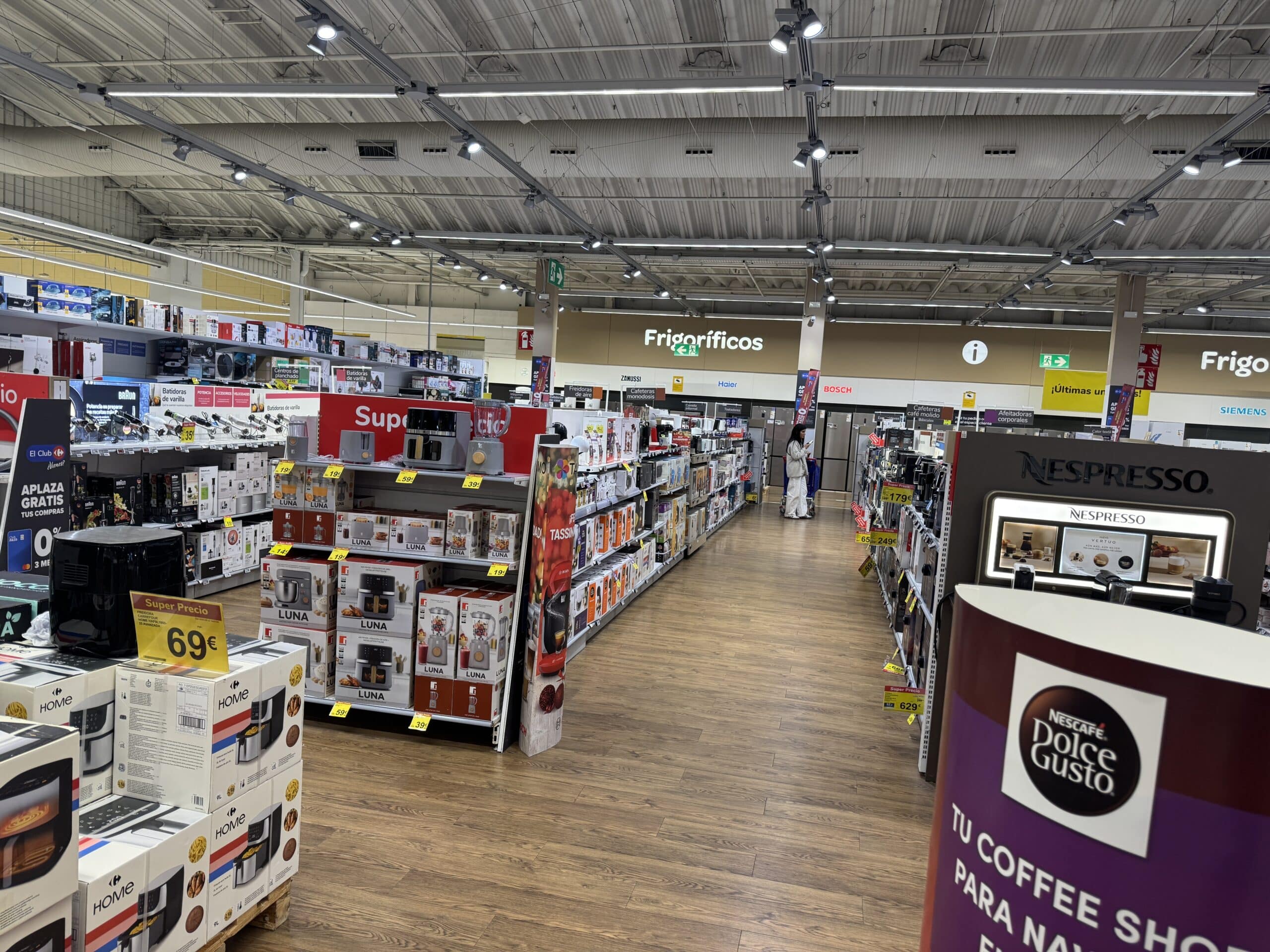 A Alcobendas, en périphérie de Madrid, l’hyper Carrefour occupe toujours une place à part dans la galaxie de l’enseigne. Dans les années 2010, il avait été choisi pour incarner la révolution “Planet” voulue par le patron de l’époque, Lars Olofsson. Quelques années plus tard, après l’échec de Planet, bis repetita. Alcobendas est encore choisi comme “proto” du nouveau concept, au même titre que Villiers-en-Bière en France ou Milan-Carrugate en Italie. Surtout, Alcobendas détient le titre du premier chiffre d’affaires espagnol avec environ 150 M€. Et, autre particularité, il est toujours une illustration marquante de la vocation historique de l’hyper du “tout sous le même toit”. Pour s’en convaincre, suffit de parcourir la zone non-al. Pour vous éviter d’y aller, vous ai fait quelques photos 😉