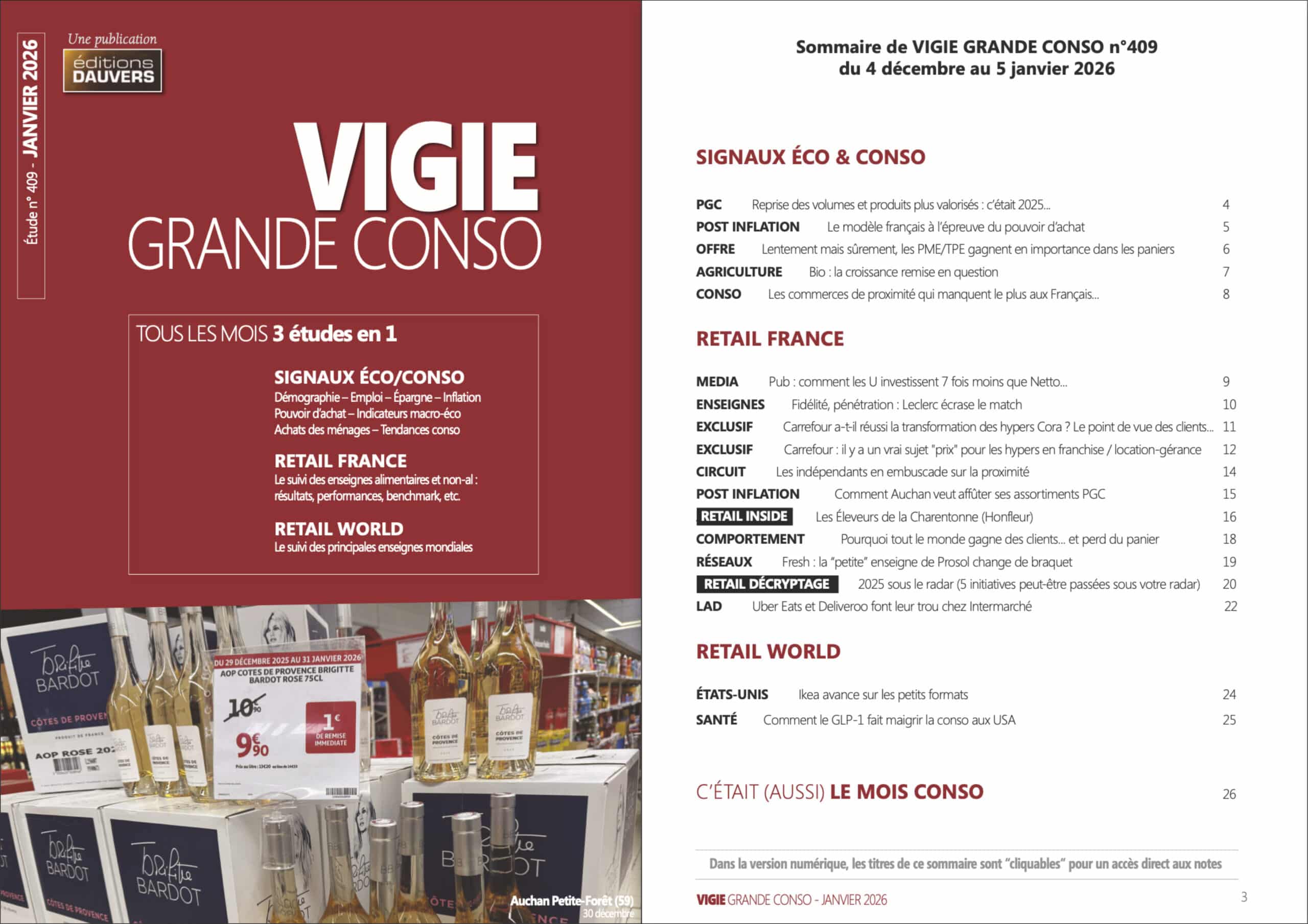 Zoom sur le sommaire de VIGIE GRANDE CONSO de janvier, n°409, diffusé cette semaine. VIGIE est le mensuel de référence sur le retail que nous publions depuis plus de 15 ans. Notre ambition ? Le plus haut niveau d’analyse et des études garanties 100 % inédites.
