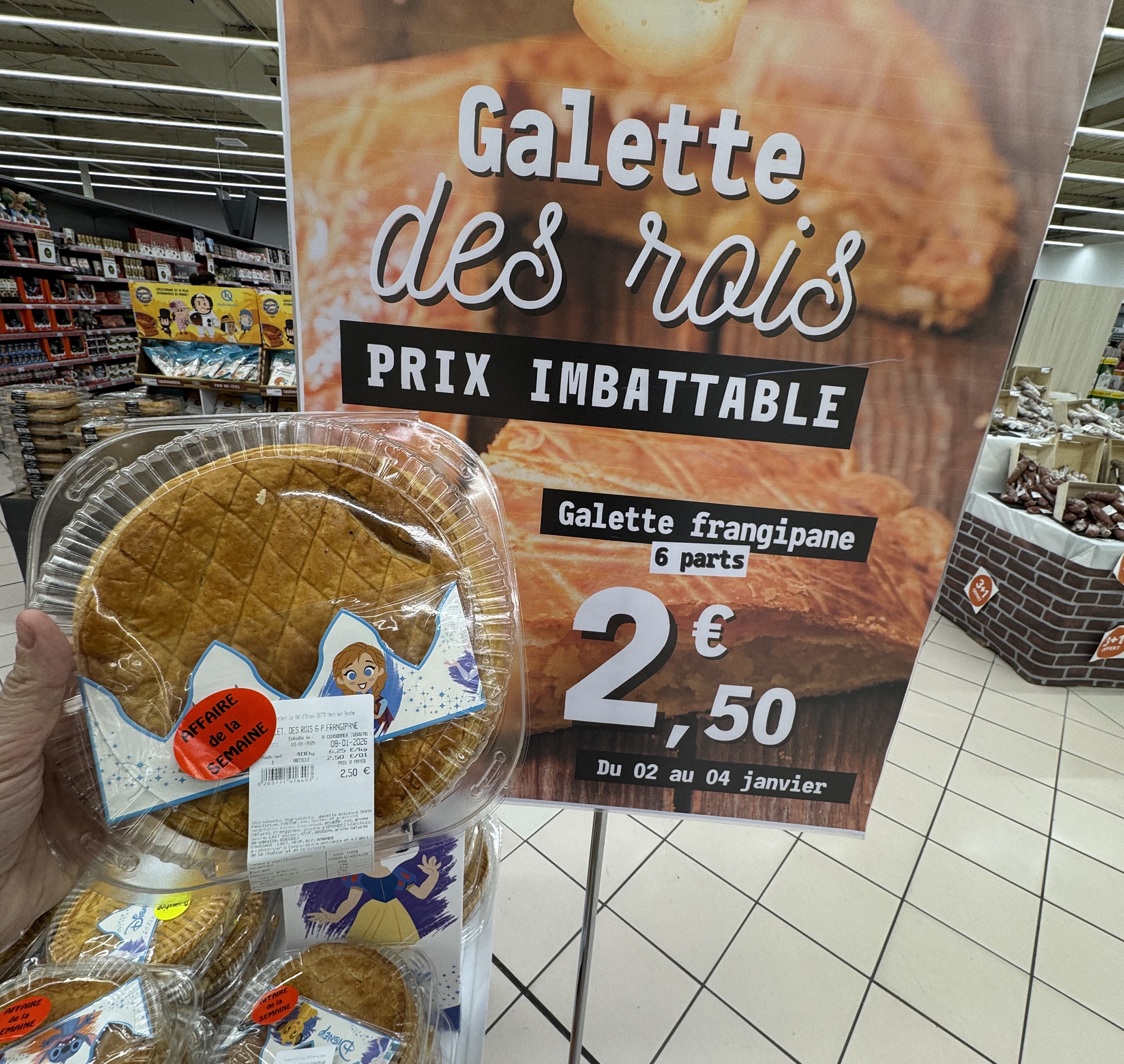 C’est « LE » week-end pour les galettes. 14 € la frangipane 4 personnes chez mon boulanger. 2,50 € la 6 parts chez Leclerc. Soit un sujet de marge, soit de revente à perte, soit les deux.