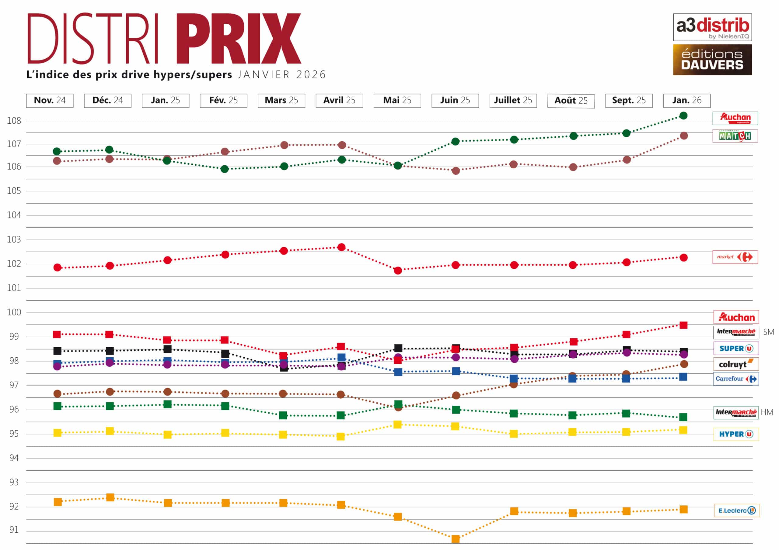 Retour de l’indice DISTRI PRIX (A3 Distrib / Ed. Dauvers) sur la base des prix observés en drives en décembre (je voulais voir si ça vous manquait, la réponse est donc clairement “oui” !). Résultat : les positionnements d’ensemble n’évoluent que peu. A retenir néanmoins : le dépositionnement régulier de Colruyt (jusqu’à sa prochaine disparition de l’indice puisque l’enseigne quitte la France) offre à Carrefour une place au pied du podium. Mais la médaille de bronze est loin : plus de 1,5 pt d’écart avec les hypers d’Intermarché. Autant dire inaccessible vu l’effort qu’il faudrait consentir ! Autre enseignement : l’effet de la baisse des prix d’Auchan au printemps s’est dissipé. Nouvelle illustration qu’en matière de prix, le plus difficile n’est pas la baisse mais… la constance !