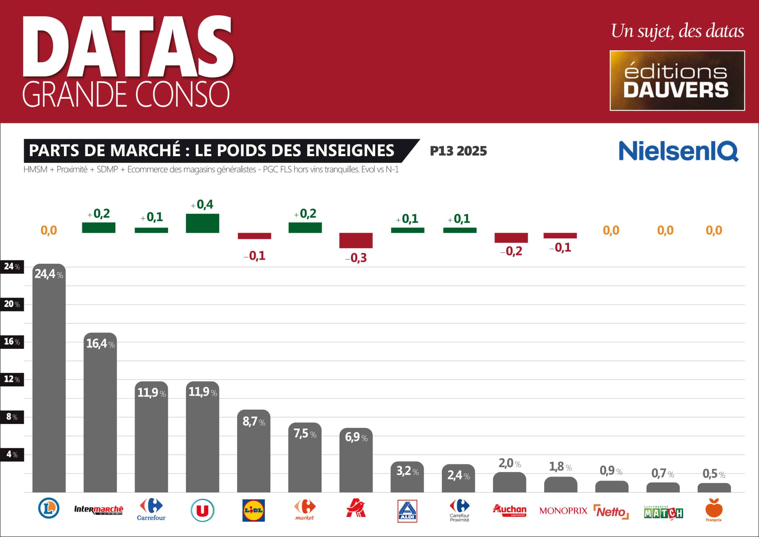 Publication cet après-midi des parts de marché NielsenIQ pour la P13, la dernière période de l’année. Une période traditionnellement favorable aux hypers (le choix, la théatralisation, etc.) et défavorable aux discounters. C’est par exemple la raison pour laquelle les hypers Carrefour sont 1 pt au-dessus sur la P13 vs la P12. Auchan fait aussi mieux : 6,9 % vs 6,2 %. A l’inverse, Lidl est en-deçà de ses étiages habituels : 8,7 % sur la P13 vs 9,4 % le mois dernier. Voilà pour la comparaison P13 / P12.