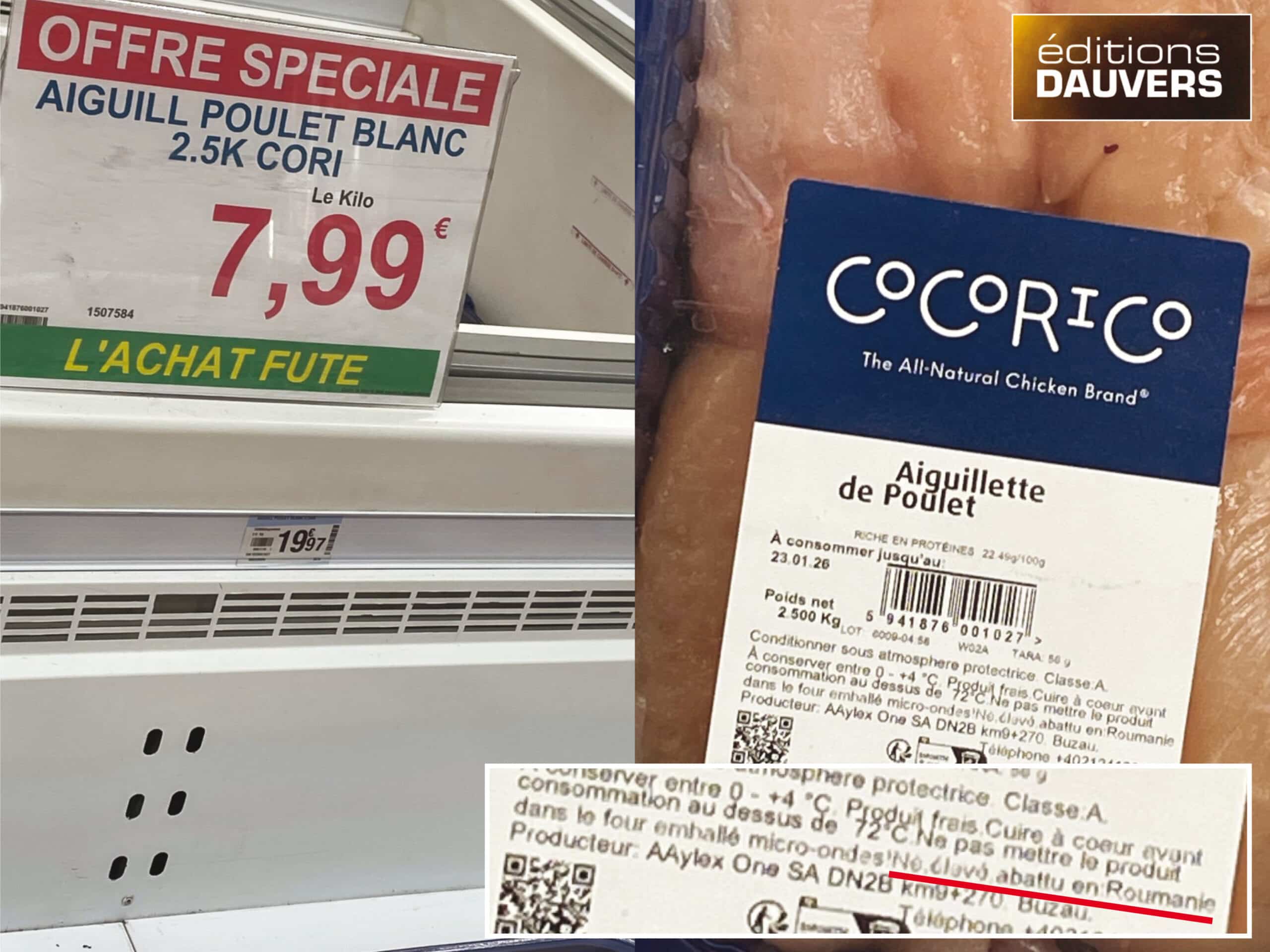 Cette transparence de l’origine est aujourd’hui soit absente soit très largement insuffisante… Exemple : aujourd’hui dans un hyper (peu importe le lieu, il se reconnaîtra) du poulet roumain (écrit en micro-caractères) sous la marque (de l’abattoir roumain) Cocorico, en caractères 10 fois plus impactants. De qui se moque-t-on ?