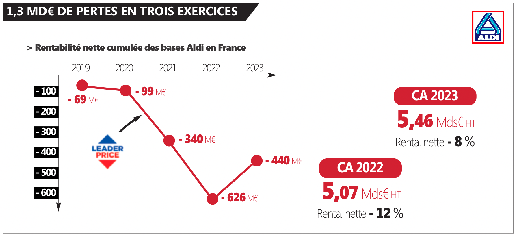 Financièrement, c’est pas mieux. 1,3 milliard de pertes de 2019 à 2023, selon les infos de VIGIE GRANDE CONSO (infographie ci-dessous). Il existe certes des signes d’amélioration. D’abord, l’exercice 2024 se serait terminé sur un EBITDA à l’équilibre avec intégration des revenus immobiliers (Aldi est propriétaire d’environ la moitié des murs). Ensuite, les ventes 2025 ont nettement progressé : + 6,5 %. Mais peut-être… trop tard !