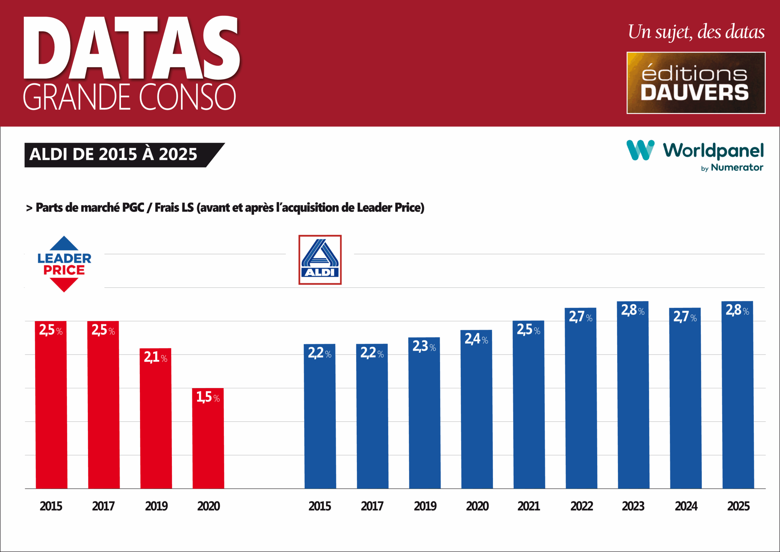 Rien d’étonnant. La situation d’Aldi en France est… “compliquée” (euphémisme). Commercialement, l’acquisition de Leader Price n’a pas porté ses fruits. En 2020, l’addition Leader Price / Aldi atteignait 3,9 %. Désormais, c’est… un point en deçà : 2,8 %. En cause : la différence (trop radicale) entre les deux concepts qui a éloigné une part des clients Leader Price attachés à la largeur d’offre.
