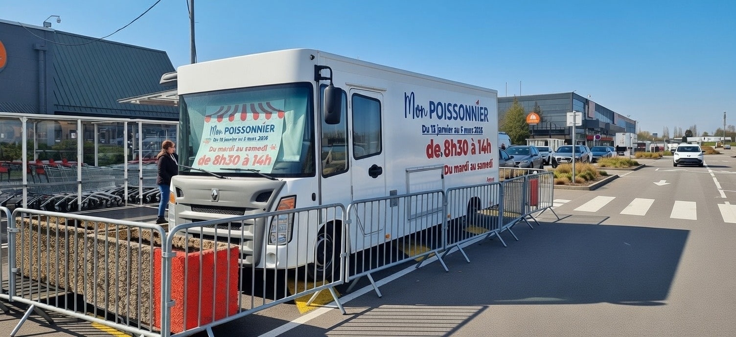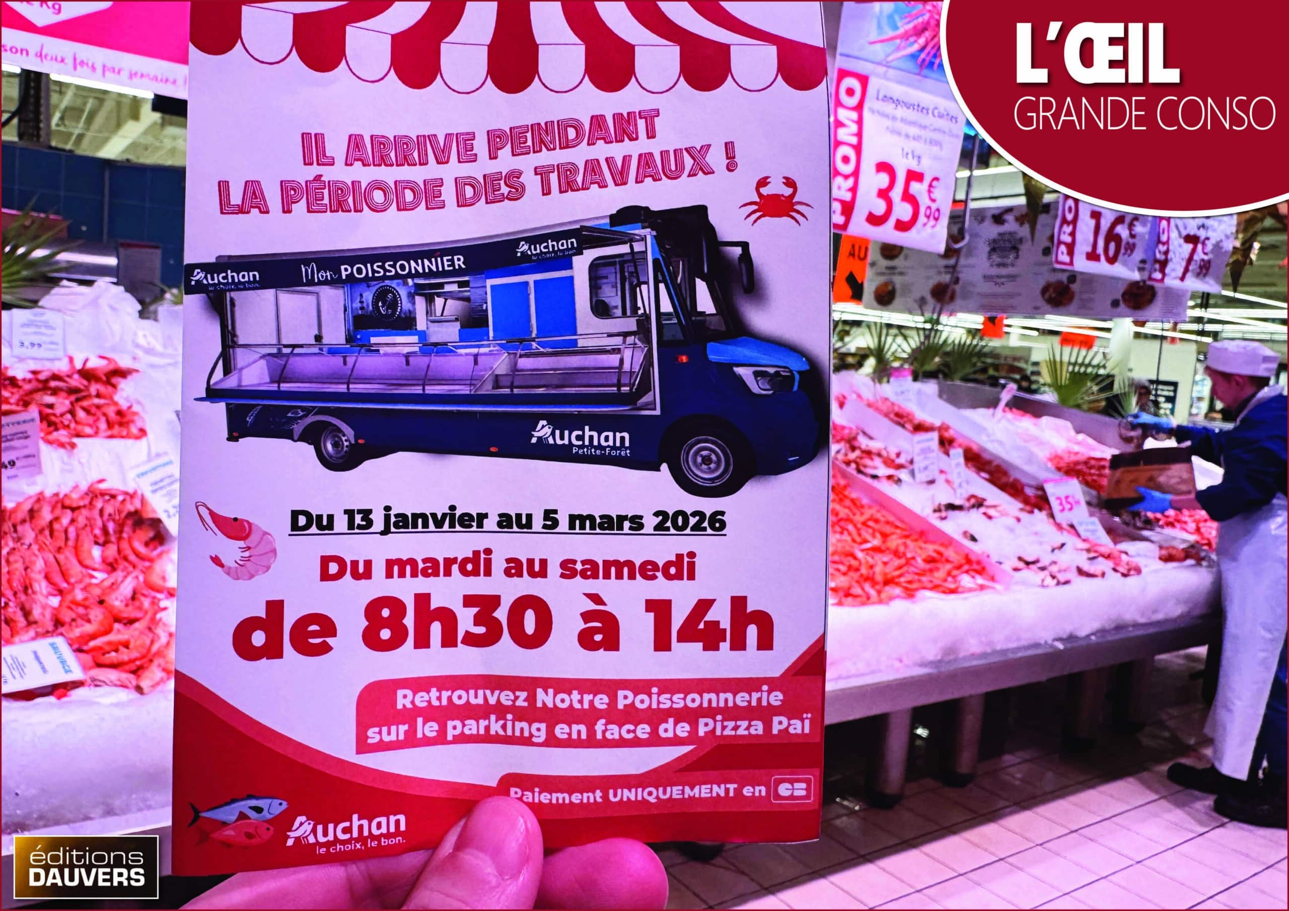 Chez Auchan (mais pas que…), de nombreux magasins sont actuellement en travaux. Au point, parfois, de condamner des rayons à la fermeture ou à… l’exil ! “L’exil” étant évidemment la solution la plus complexe à gérer (mais la moins déceptive pour les clients). Exemple depuis cette semaine ici à Auchan Petite Forêt (59) avec le rayon marée déporté sur le parking de l’hyper ! Pendant les travaux, la vente continue.