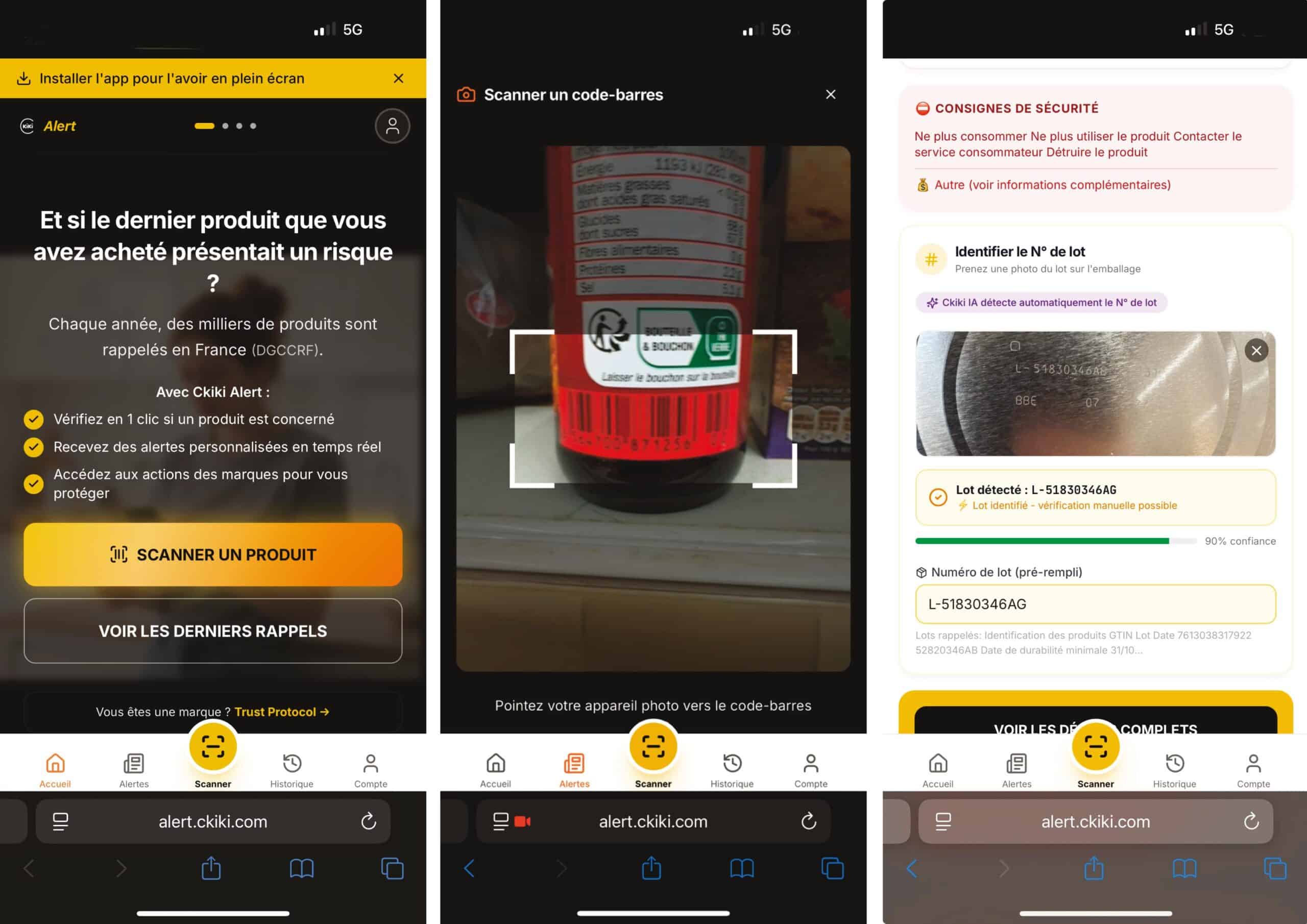 L’objectif, via une webapp, est de permettre au client de savoir immédiatement et avec certitude si le produit qu’il a dans son placard/son frigo est concerné par un rappel (qu’il a peut-être vu en magasin ou sur les réseaux). L’identification du produit se fait en deux temps : d’abord, le scan du code-barre (pour valider si le produit est concerné), ensuite la photo du numéro de lot indiqué le paquet. La reconnaissance d’image et un brin d’IA font le reste : vérifier (via la base rappel conso) si l’article précis que le client possède chez lui est rappelé ou pas. Et donc concerné par une procédure de remboursement. C’est (le cas échéant) l’étape d’après… Si le client a encore la preuve d’achat (qui peut être l’historique de son compte fidélité via l’appli de l’enseigne), alors Ckiki alert peut aussi gérer le remboursement. J’vous avais prévenu : l’idée est simple. Mais possiblement très utile !