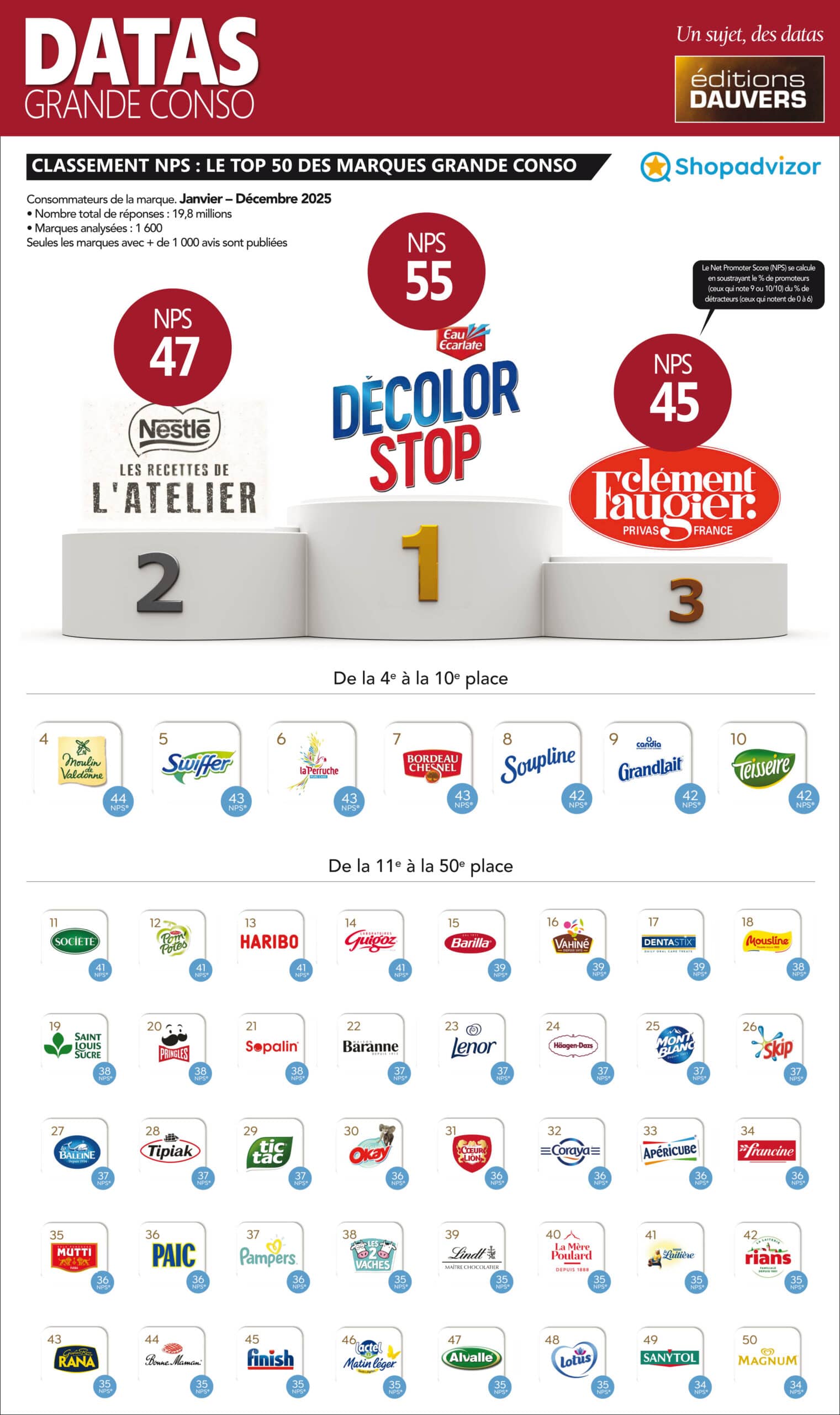 Vous avez donc, là, les 50 marques les plus recommandées, préférées, estimées, etc. Bref, les best-in-class ! Avec, au passage, une confirmation : Decolor Stop est le champion des champions ! L’an dernier, déjà, sur la même méthodologie, la marque avait raflé la mise (revoir ici). Mieux, elle améliore son score : de 47 à 55. Sur les deux autres marches du podium : le grand écart. D’un côté Nestlé, environ 100 milliards d’euros de CA, pour sa marque “Les recettes de l’Atelier” ; de l’autre Clément Faugier, le spécialiste des marrons, qui pèse à peine plus de 20 millions d’euros. Point commun à ces trois marques : leur haut niveau de satisfaction, signe qu’elles sont chacune au rendez-vous de leur promesse. L’efficacité pour Decolor Stop, la gourmandise pour Nestlé et Faugier.