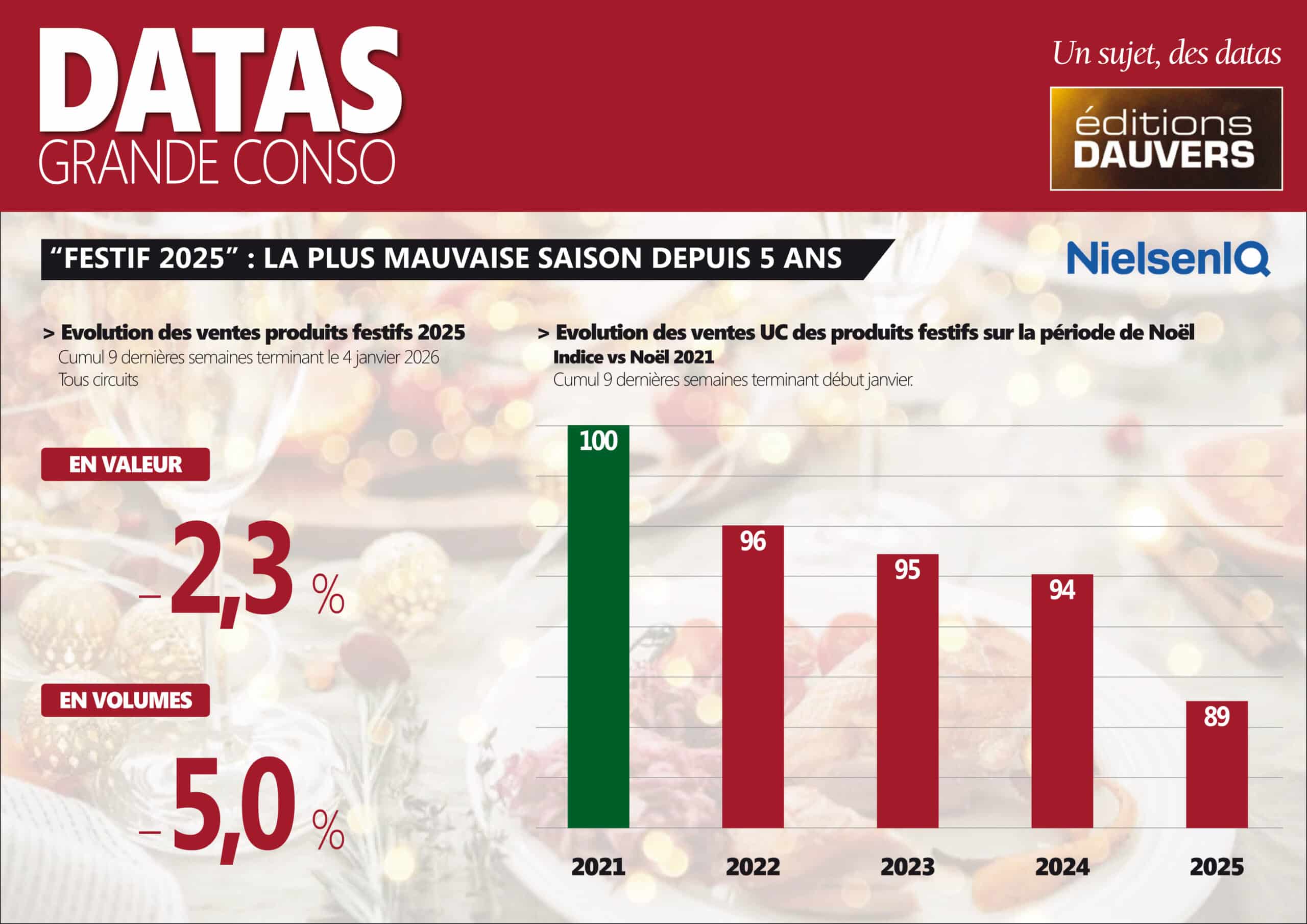 Selon NielsenIQ, les ventes de produits festifs ont baissé à la fois en valeur et en volume sur la saison. Respectivement – 2,3 % et – 5 % vs 2024. En remettant un peu de perspective, Noël 2025 est même le pire Noël depuis 5 ans. Ce qui dit beaucoup de l’état de la conso…
