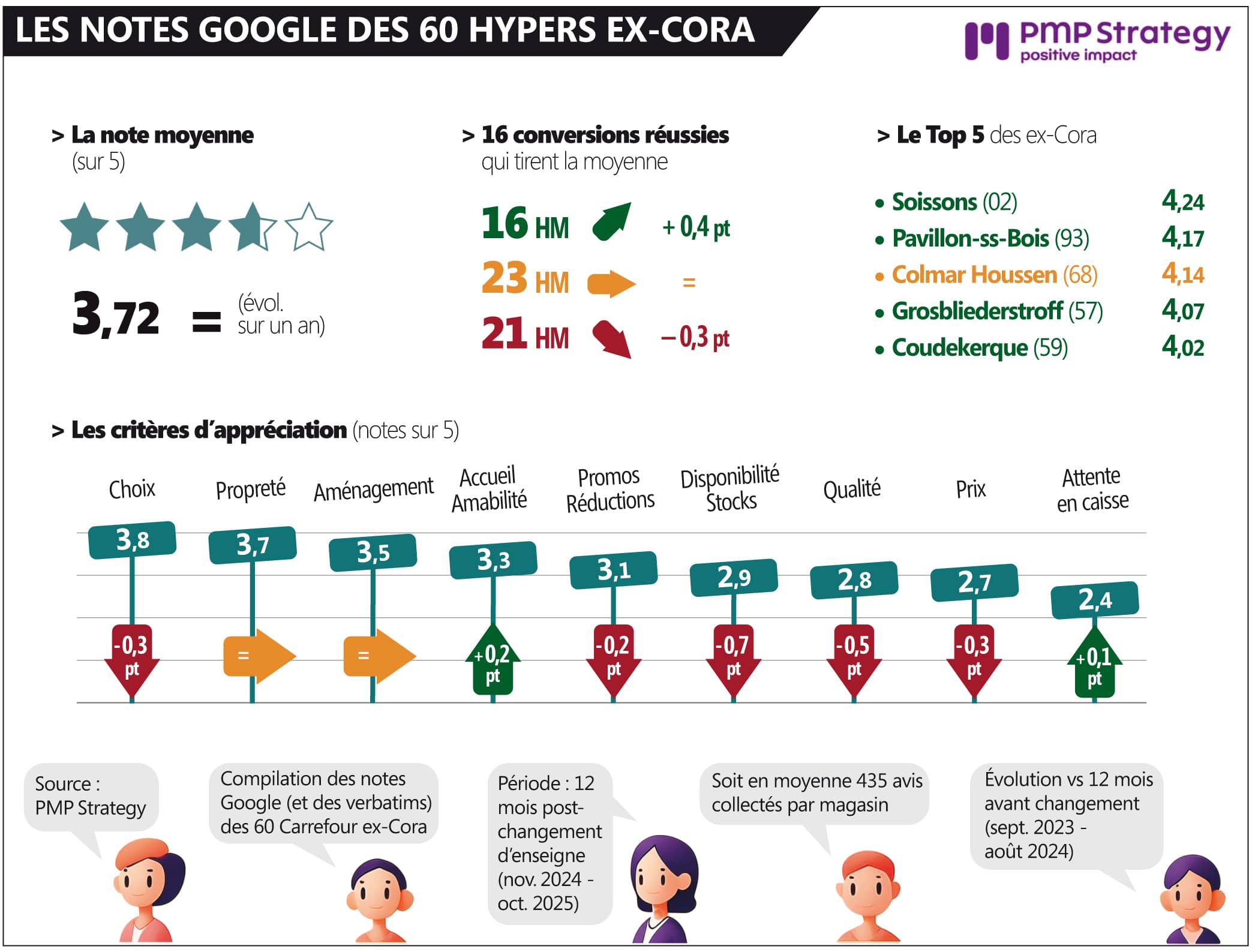 Carrefour a sous-estimé l’attachement des clients Cora à “leur” enseigne. La puissance nationale de la marque Carrefour ne pèse finalement guère face à l’ancrage des habitudes locales… Sur la base des avis Google déposés par les clients depuis le changement d’enseigne, et collectés par PMP Strategy, l’arrivée de Carrefour n’a suscité aucun enthousiasme. La note moyenne des 60 ex-Cora reste scotchée à 3,72 sur 5 depuis un an. Exactement au même niveau que l’année qui avait précédé le changement d’enseigne.
