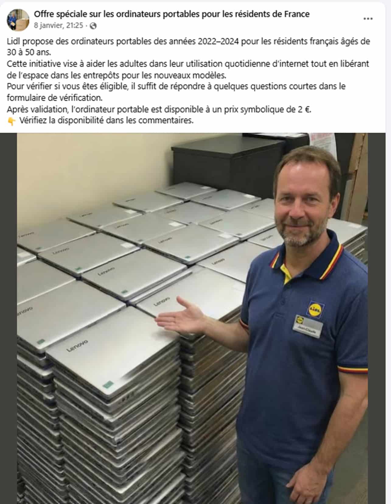 Le plus courant actuellement ? Un prix défiant toute concurrence sur un produit d’équipement. Ici 2 € pour un ordinarteur portable Lenovo. Et toujours la même technique : une pub sur les réseaux sociaux, une histoire crédible (une offre canon parce qu’il faut vider les entrepôts de machines un peu anciennes) et une pseudo enquête pour donner une apparence sérieuse à la chose.