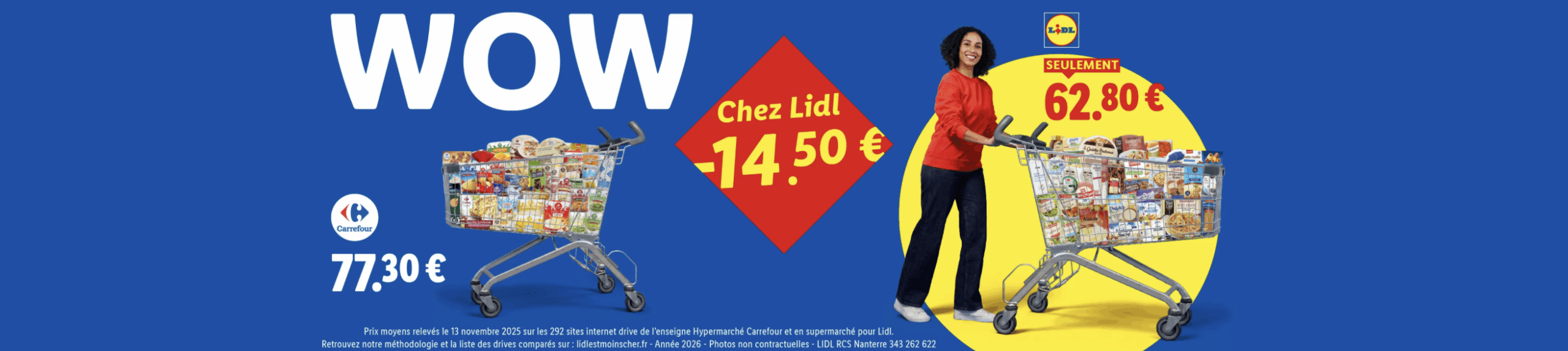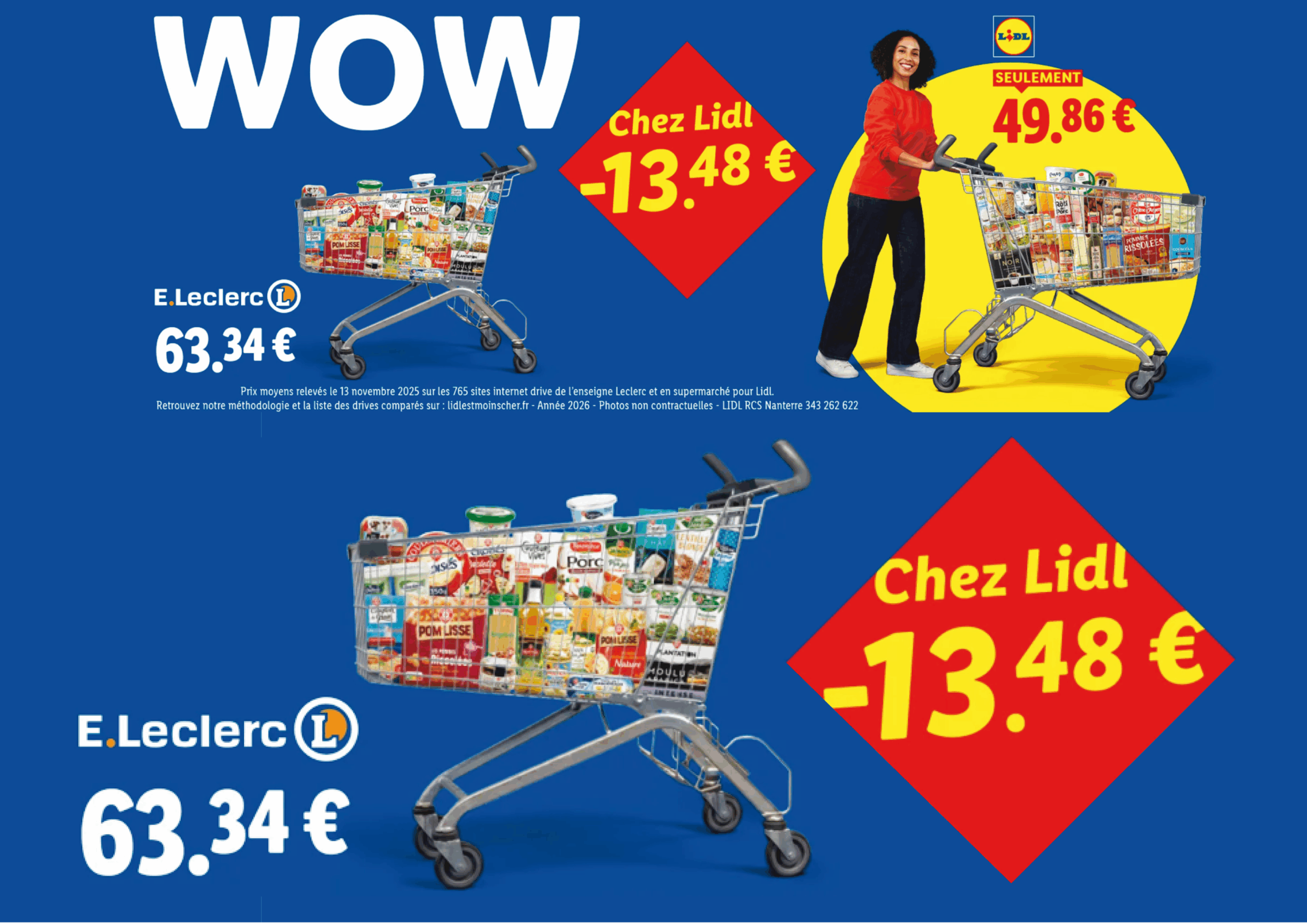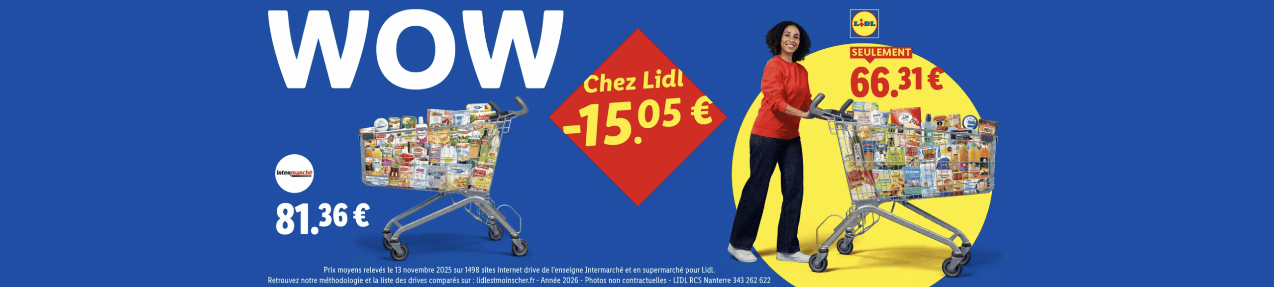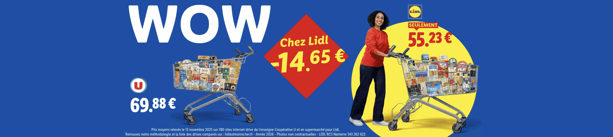 On avait laissé Lidl à l’automne avec une campagne de publicité comparative pointant les différences de prix au sein de magasins d’une même enseigne concurrente (revoir ici), voilà une nouvelle couche et une nouvelle approche. Toujours les 4 mêmes cibles : Leclerc (évidemment !), Carrefour, Intermarché et U. Cette fois-ci, pas de produits isolés, mais un panier “d’une trentaine de MDD“. Classique levier de la pub comparative pour laisser à penser que l’écart de prix présenté peut être extrapolé à l’ensemble du magasin. Parce qu’évidemment Lidl a calculé des écarts qui ne réflètent pas la réalité globale (mais qui attend de la publicité comparative qu’elle décrive autre chose que ce qu’elle montre 🤣😂😅 ?). Ainsi, sur les chariots mis en scène, Leclerc et les U sont affichés 27 % plus chers que Lidl, Carrefour et Intermarché 23 %. Pour se prémunir de toute remise en cause méthodologique, Lidl a fait valider la comparabilité des MDD par un “laboratoire assermenté” (ça claque comme formulation !), Sensor E Panel à Clermont-Ferrand. Mais j’imagine quand même que les mis en cause iront mettre un œil dans la méthodologie. D’ailleurs, ça vous évitera de la chercher, la voilà ici. Et pour la liste des produits comparés, c’est là. De rien !