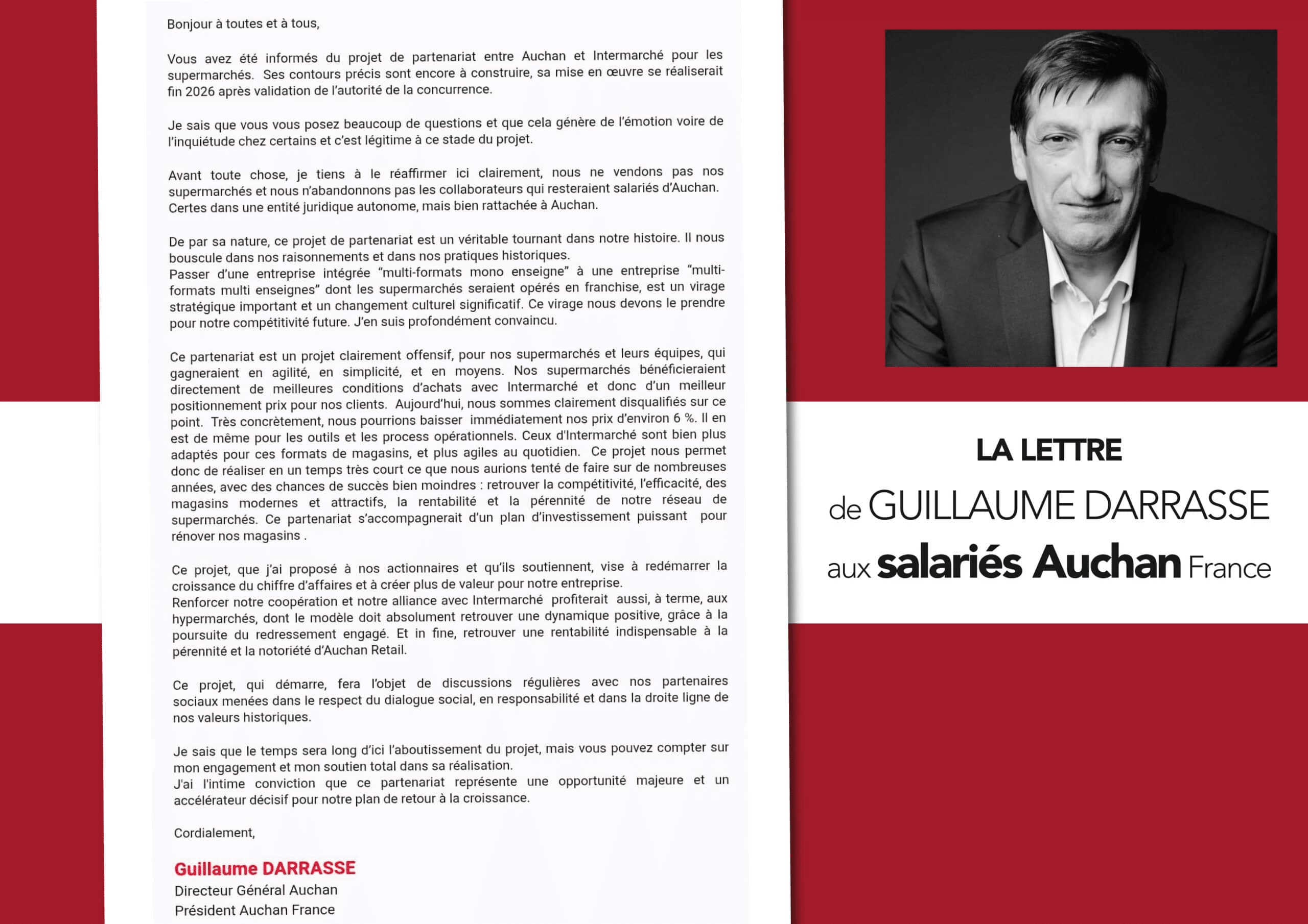 Comparé aux précédents patrons, Guillaume Darrasse a une qualité pour l’exercice : il n’est pas de la famille. Et son passage à la tête de Jardiland/Delbard et Gamm vert lui a sans doute appris l’art de la taille 😉. Quitte à se renier… Fin novembre, dans une lettre aux salariés pour expliquer le contrat de franchise avec Intermarché et que je révélais (ci-dessous), il affirmait “nous ne vendons pas nos supermarchés“. De fait, tous les supermarchés ne sont pas en vente. Mais une part non négligeable quand même.