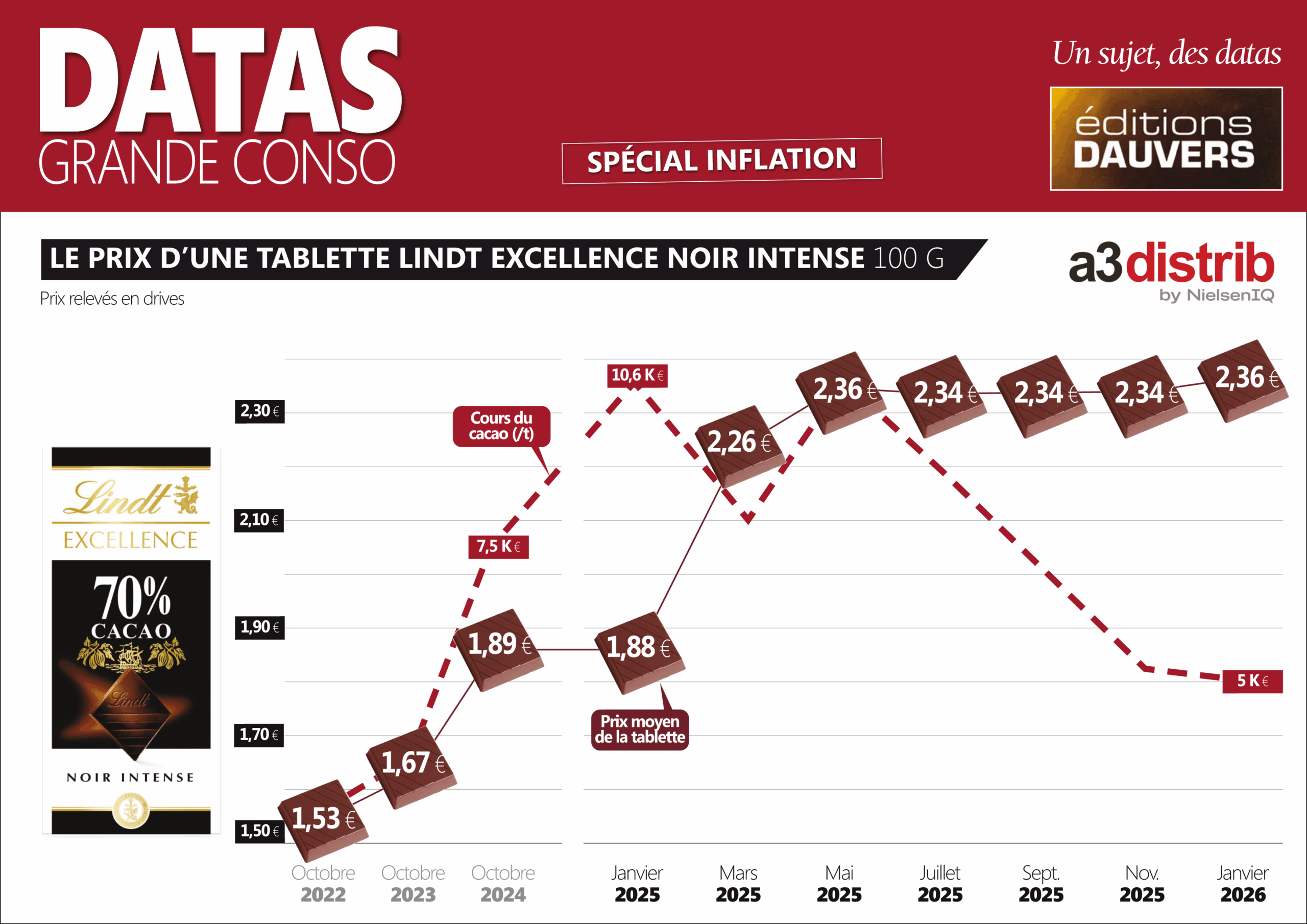 Cas pratique donc : l’envolée des prix du chocolat. En cause, l’inflation (réelle) du cours du cacao sur les marchés mondiaux. Alors que la tonne s’échangeait entre 2 et 3 000 dollars depuis des années, le cours s’est brutalement envolé en 2024. La faute à de mauvaises prévisions de récolte et à la spéculation qui a suivi. Il y un an, le cours dépassait alors les 10 000 dollars. Désormais, la tonne de cacao est à moins de 5 000 dollars (et même plus proche de 4 000 depuis quelques jours). La baisse est régulière depuis le milieu d’année dernière. Et pourtant, le prix en rayon est toujours au plus haut, par exemple 2,36 € pour l’une des références star, Lindt Excellence 70 %. En réalité, c’est encore normal : l’explication réside dans les engagements de long terme des chocolatiers et du temps d’écoulement des stocks. D’ailleurs, la hausse avait aussi été décalée dans le temps. D’octobre 2024 à janvier 2025, le cours avait doublé alors que la tablette était restée stable !