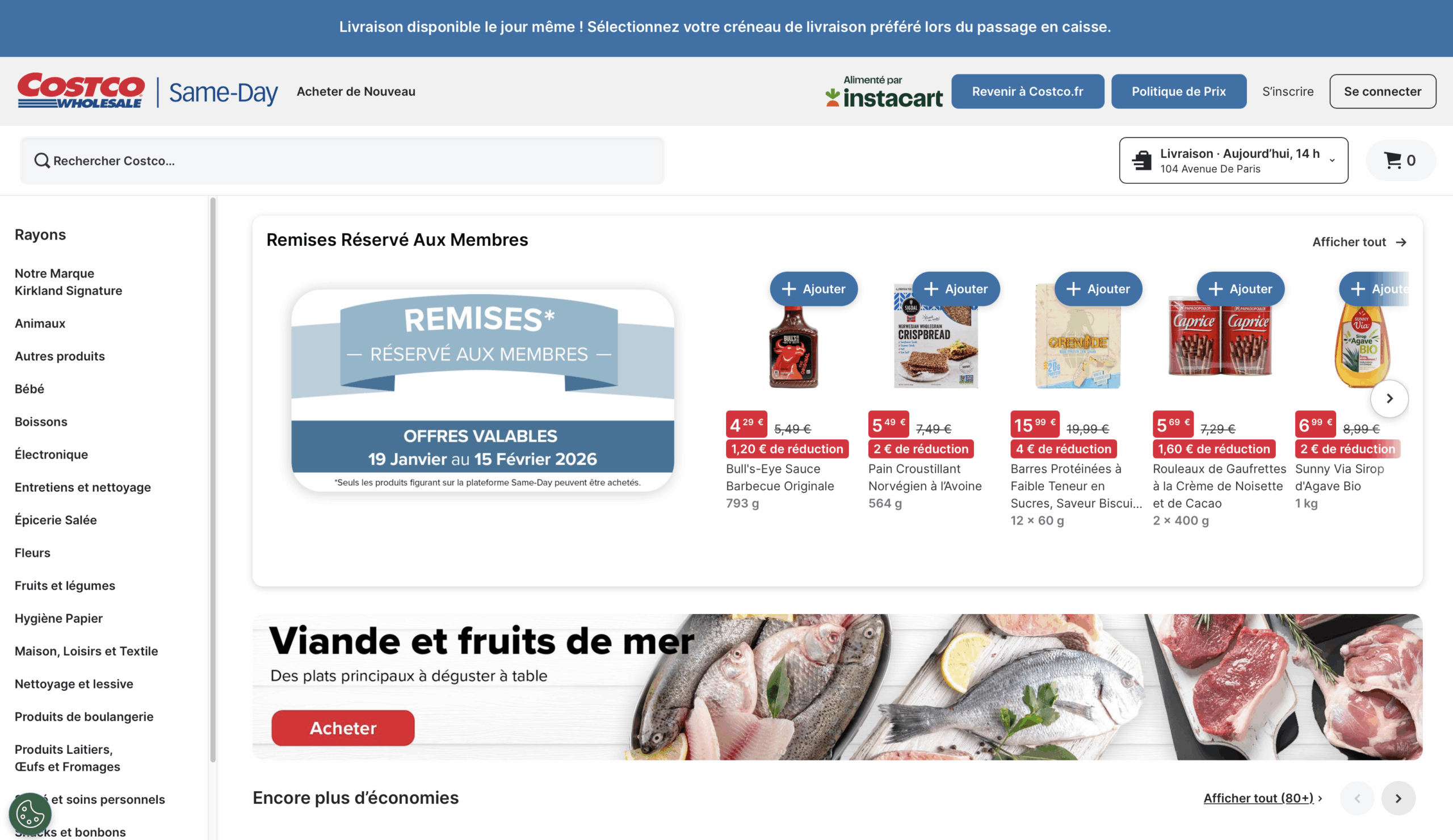 Concrètement, Costco a mis en ligne la totalité de son offre, minorée des alcools et des produits à plus de 250 €. Le site marchand n’est accessible qu’aux membres (ceux qui ont souscrit l’abonnement de 36 € par an) et promet une livraison le même jour, d’où le nom du service “Costco same-day”. Les prix sont identiques aux magasins (Villebon, Pontault et Mulhouse), mais 15 € sont rajoutés au panier pour frais de préparation et de livraison. Et c’est là où entre en piste Instacart qui assure donc (comme aux États-Unis) la préparation de la commande en magasin et la livraison. Pour les 3 Costco français, un même rayon d’action : 30 mn. En clair : le sud de Paris est donc “livrable” depuis Villebon.