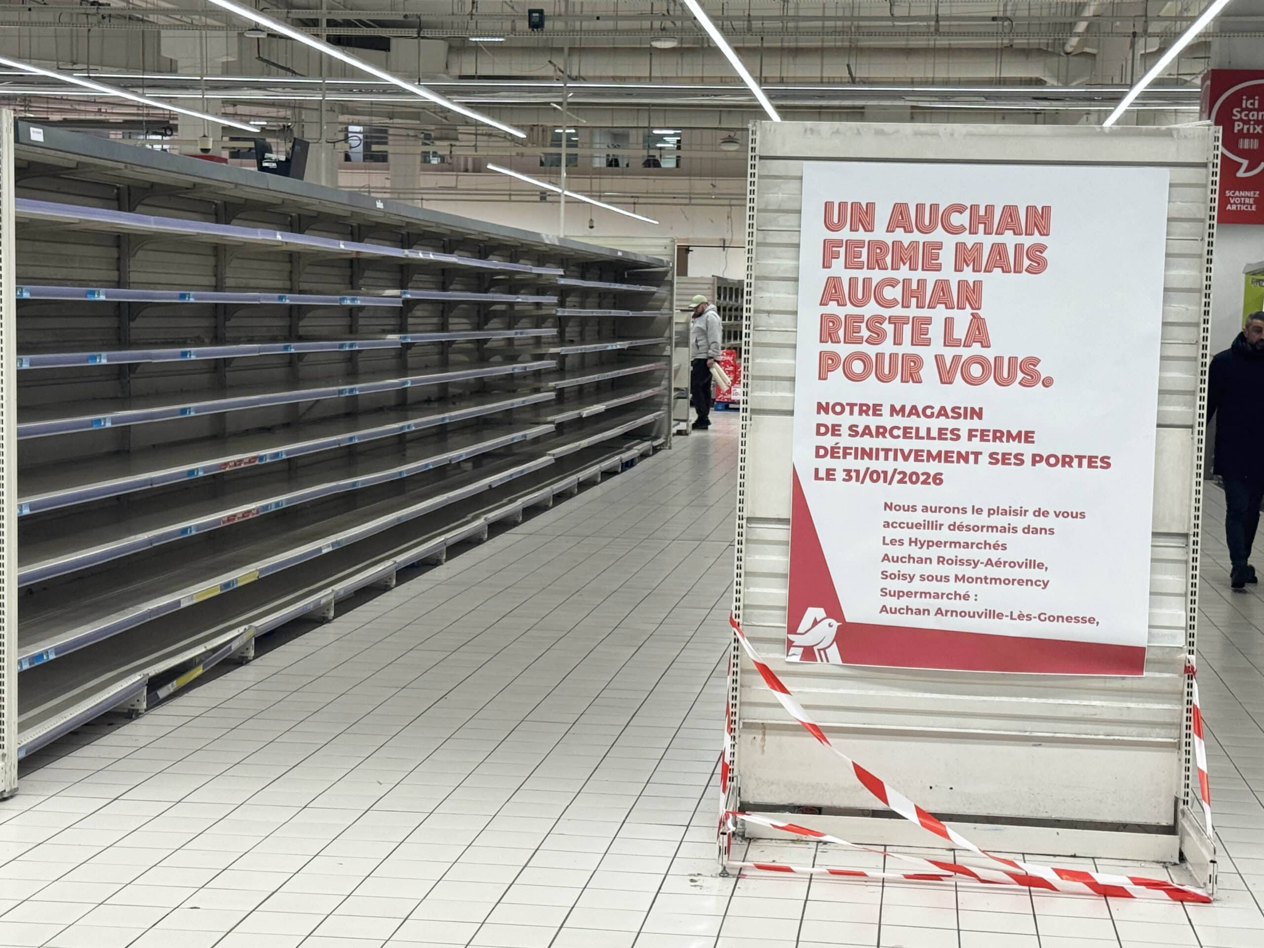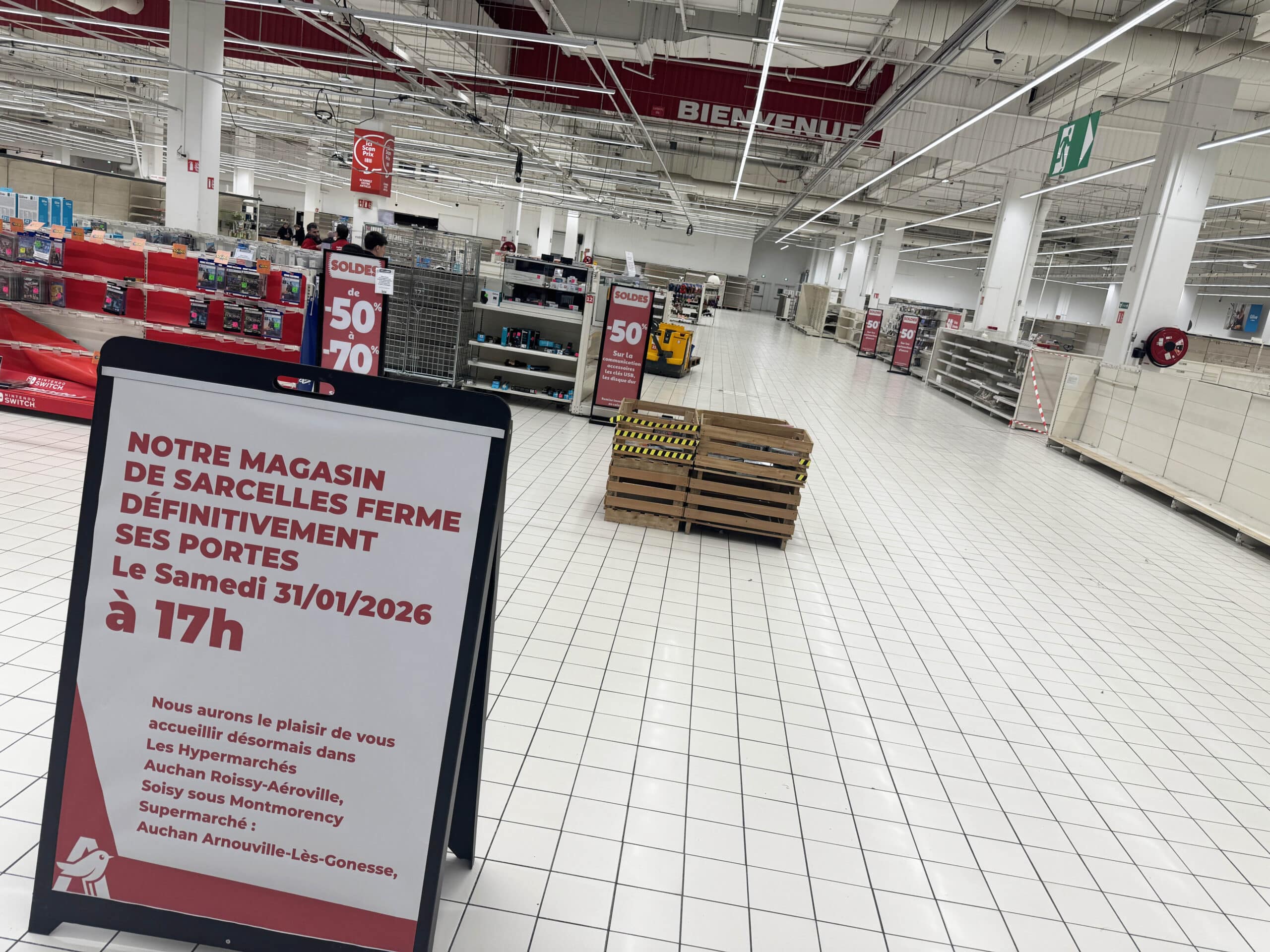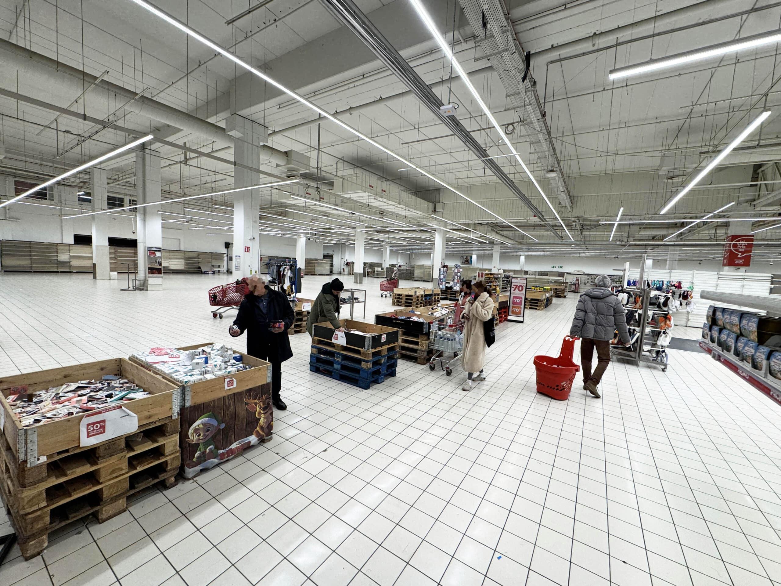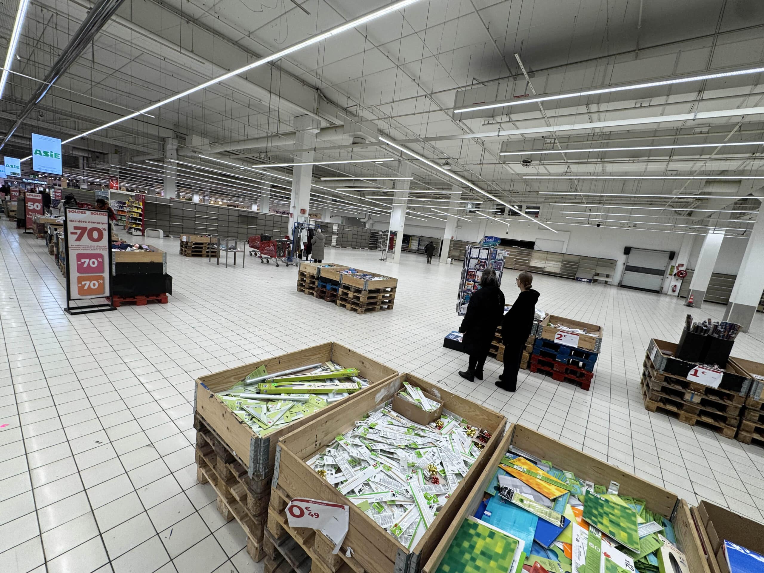 Toujours les mêmes images, glaçantes, à quelques jours de la fermeture d’un magasin… Demain, donc, Auchan Sarcelles baissera définitivement le rideau. 14 ans et 2 mois après l’ouverture, c’était fin 2011 (revoir mon reportage photos de l’époque en fin de post). D’ici là, l’hyper brade, écoule, déstocke, range. Un tiers de la surface de vente (le non-al) est déjà condamné. Le reste des rayons est plus que clairsemé. L’objectif ? “Atterrir” avec la valeur de stock la plus faible possible, quitte à afficher – 50 % sur tout l’alimentaire depuis ce matin (ce qui devrait aider à nettoyer les rayons).