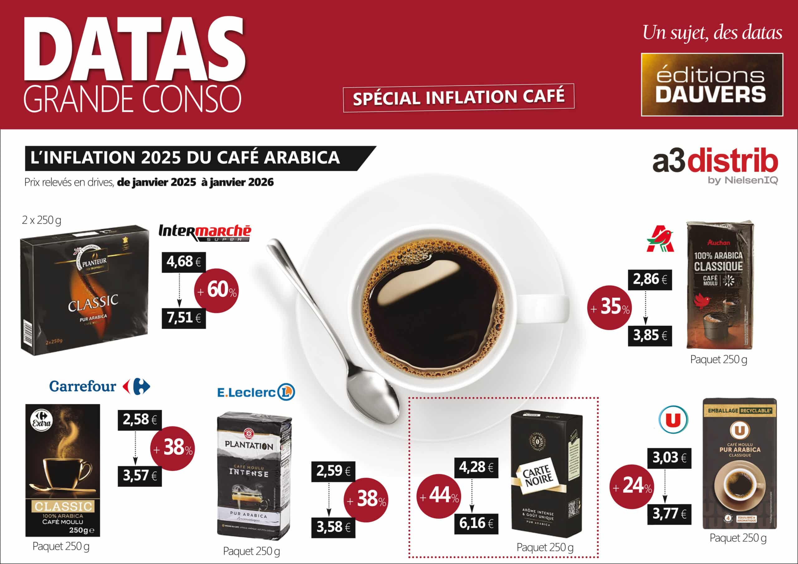 Dimanche infographie, suite. Toujours sur le thème du café, le produit dont les étiquettes ont le plus flambé depuis un an (devant le chocolat et la viande). Cette fois : comparaison entre l’évolution de la marque nationale (Carte Noire) et les MDD. A l’exception d’Intermarché (ce qui étonne), les MDD sont moins inflationnistes que Carte Noire alors que le bon sens aurait commandé l’inverse : la part de la matière première dans la structure de coûts est plus importante dans les MDD (ou les premiers prix) que dans les marques nationales. Ce qui laisse donc à penser que Carte Noire avait plutôt réussi ses négos 2025. Et je sais que c’est vache (de ma part) de sortir ça en pleine négos 2026. D’un autre côté, c’est un fait !