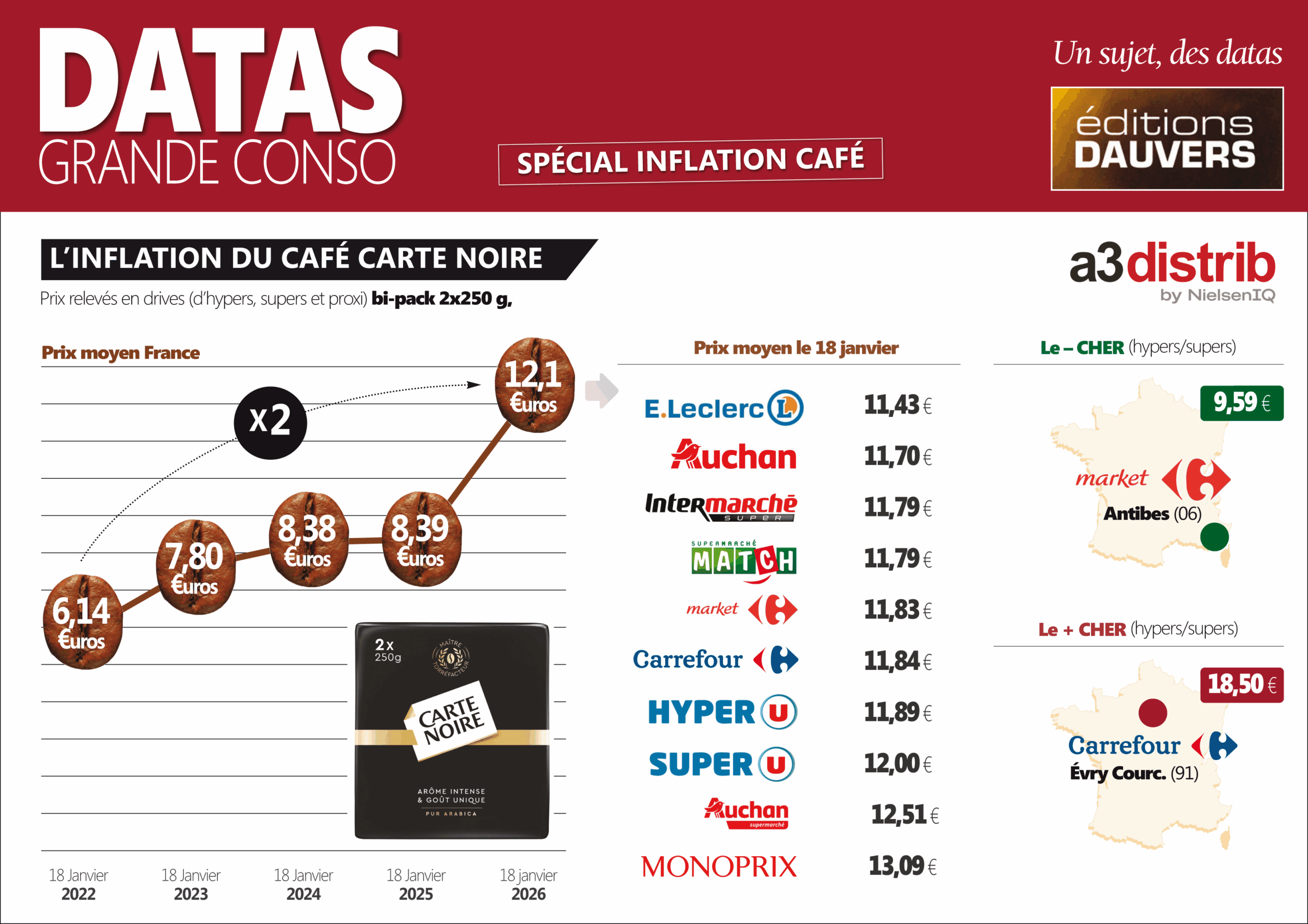 Il y avait le pétrole, il y aura aussi désormais le café, devenu véritable “or noir” depuis l’envolée des cours entamée en 2022. La matière première se paye aujourd’hui environ 3 fois plus cher que la moyenne des années 2025/2020. Et, sans surprise, le prix a rayon a suivi la tendance. Certes moins rapidement : le prix de l’une des stars du rayon, le bipack de Carte Noire, n’a “que” doublé (la matière première n’est qu’une composante du prix final). Il n’empêche, la note est salée pour les amoureux du p’tit noir. Du p’tit or noir !