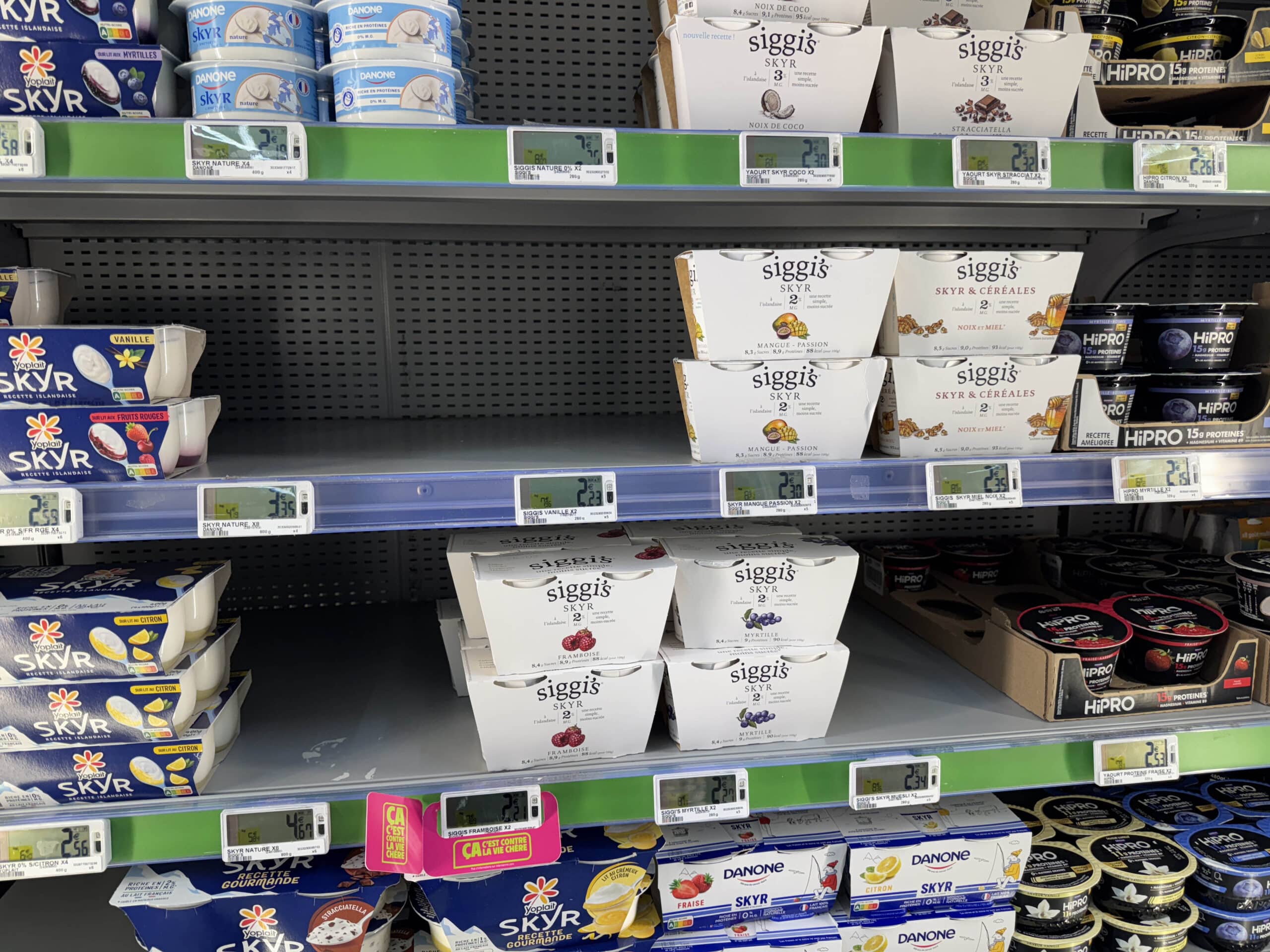 Il y a une semaine et sur la foi de la baisse de diffusion de plusieurs produits Lactalis chez Intermarché, je pressentais le conflit (revoir ici). Aujourd’hui, nul pressentiment mais une affirmation : il y a bien conflit entre Intermarché et le géant laitier. Et un conflit qui prend une tournure particulière depuis quelques jours. Après avoir diminué le niveau de commandes de l’ensemble des gammes Lactalis, Intermarché opère actuellement un déréférencement plus chirurgical, en fonction du pays de provenance des produits (pour ne pas être pris à parti par les éleveurs français). En clair, les commandes ont cessé sur les produits made in ailleurs (mais ont repris sur les produits français). Par exemple les “yaourts” Siggi’s (Slovénie) ou la gamme Galbani (Italie). En tout, selon mes informations, plus de 70 codes. D’ailleurs, p’tit truc pour identifier les produits qui ne sont plus commandés (et qui vont donc disparaître) : le “D” sur l’étiquette électronique.