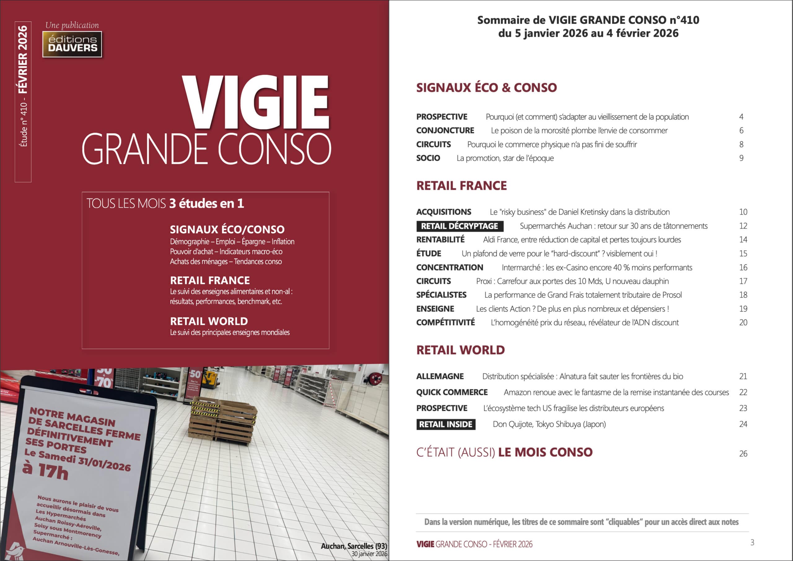 Zoom sur le sommaire de VIGIE GRANDE CONSO de février, n°410, diffusé cette semaine. VIGIE est le mensuel de référence sur le retail que nous publions depuis plus de 15 ans. Notre ambition ? Le plus haut niveau d’analyse et des études garanties 100 % inédites.
