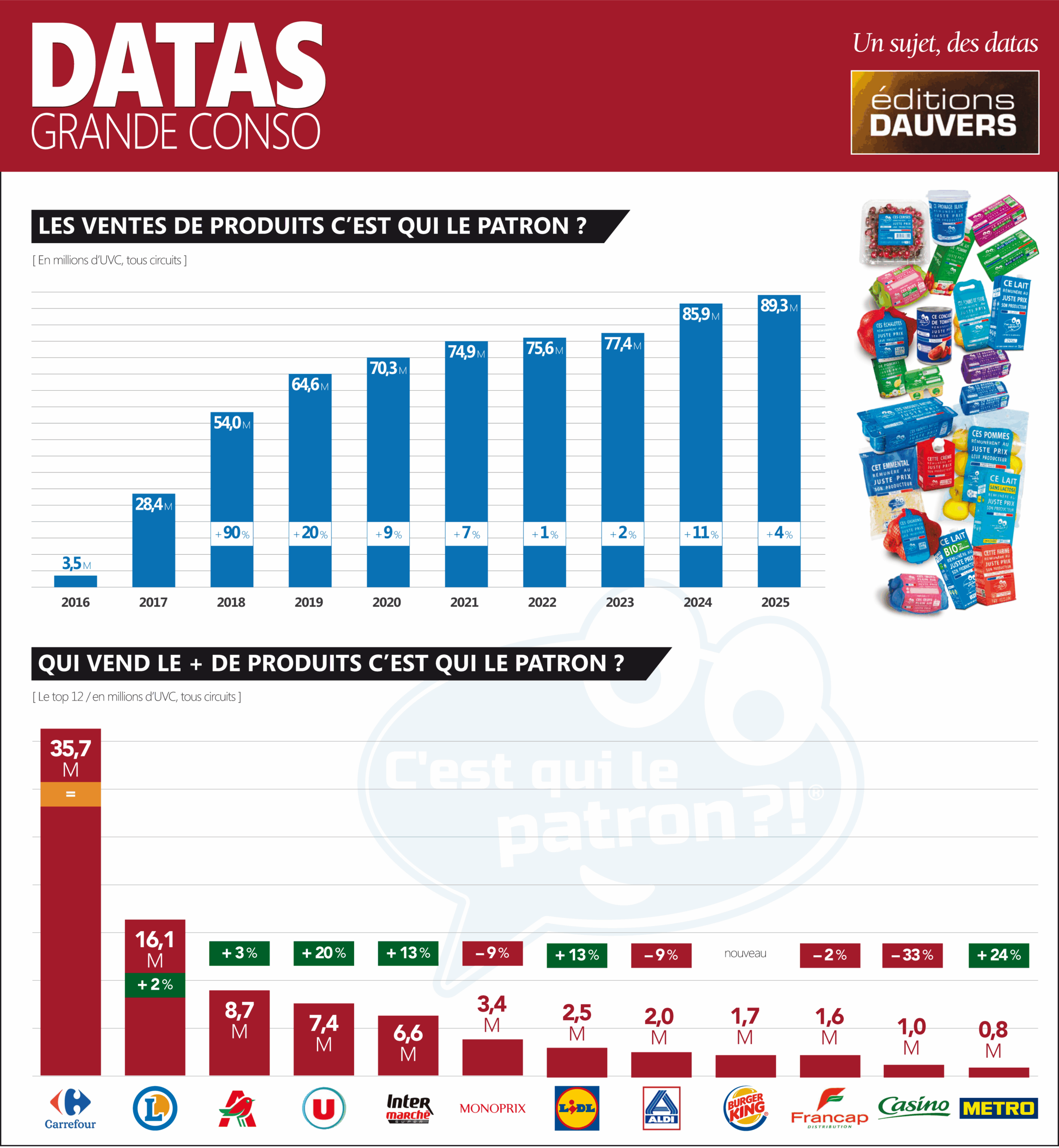 Dimanche infographie : les ventes de C’est qui le patron sur l’exercice 2025. Les produits solidaires, portés par la coopérative de consommateurs aux 17 000 membres (j’en suis), ont encore cru de 4 % l’an dernier à 89,3 millions. Les 100 millions d’unités sont donc en ligne de mire. Les nouveaux produits (fruits et légumes par exemple) vont y contribuer. De nouveaux référencements aussi, par exemple chez Intermarché.