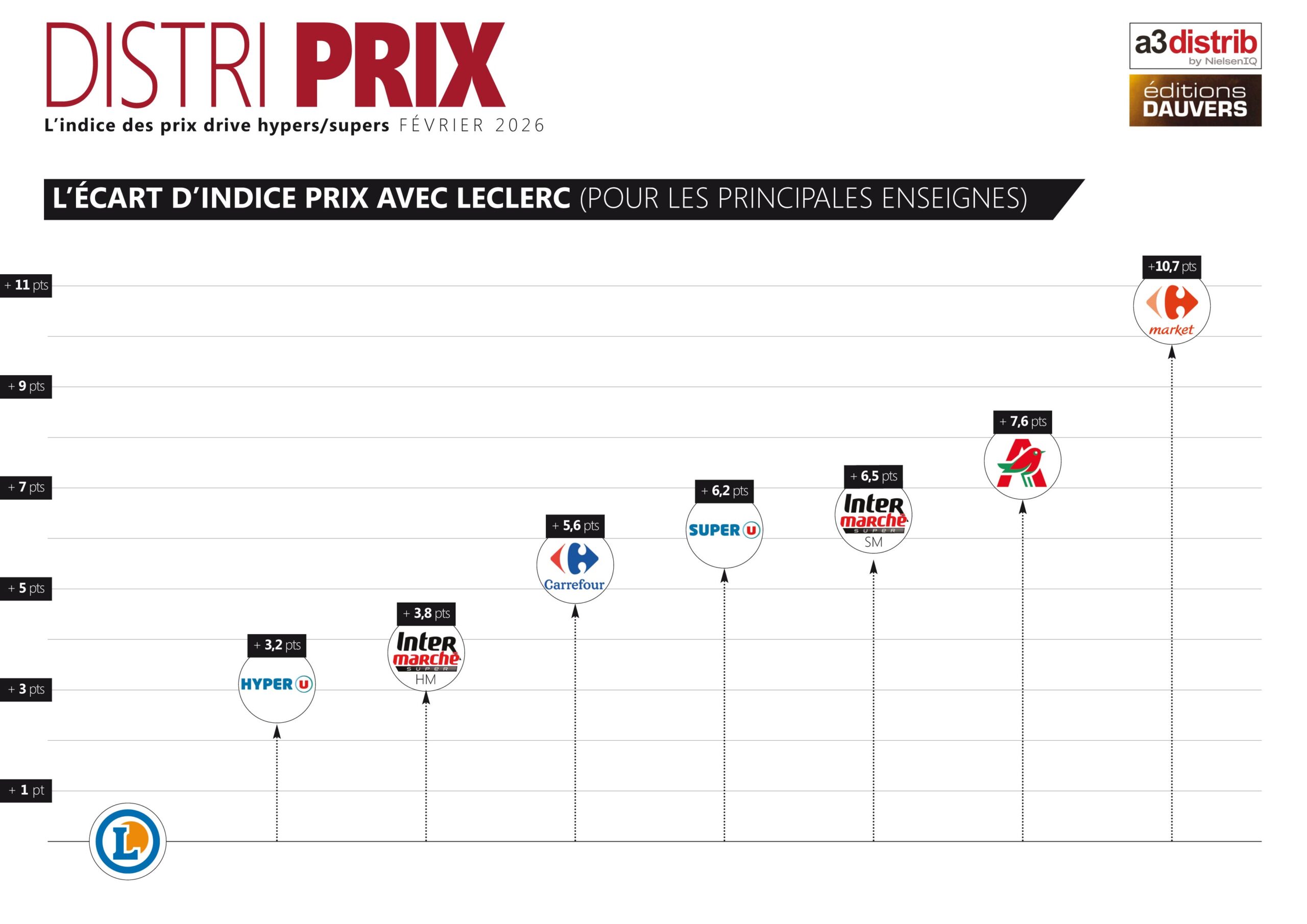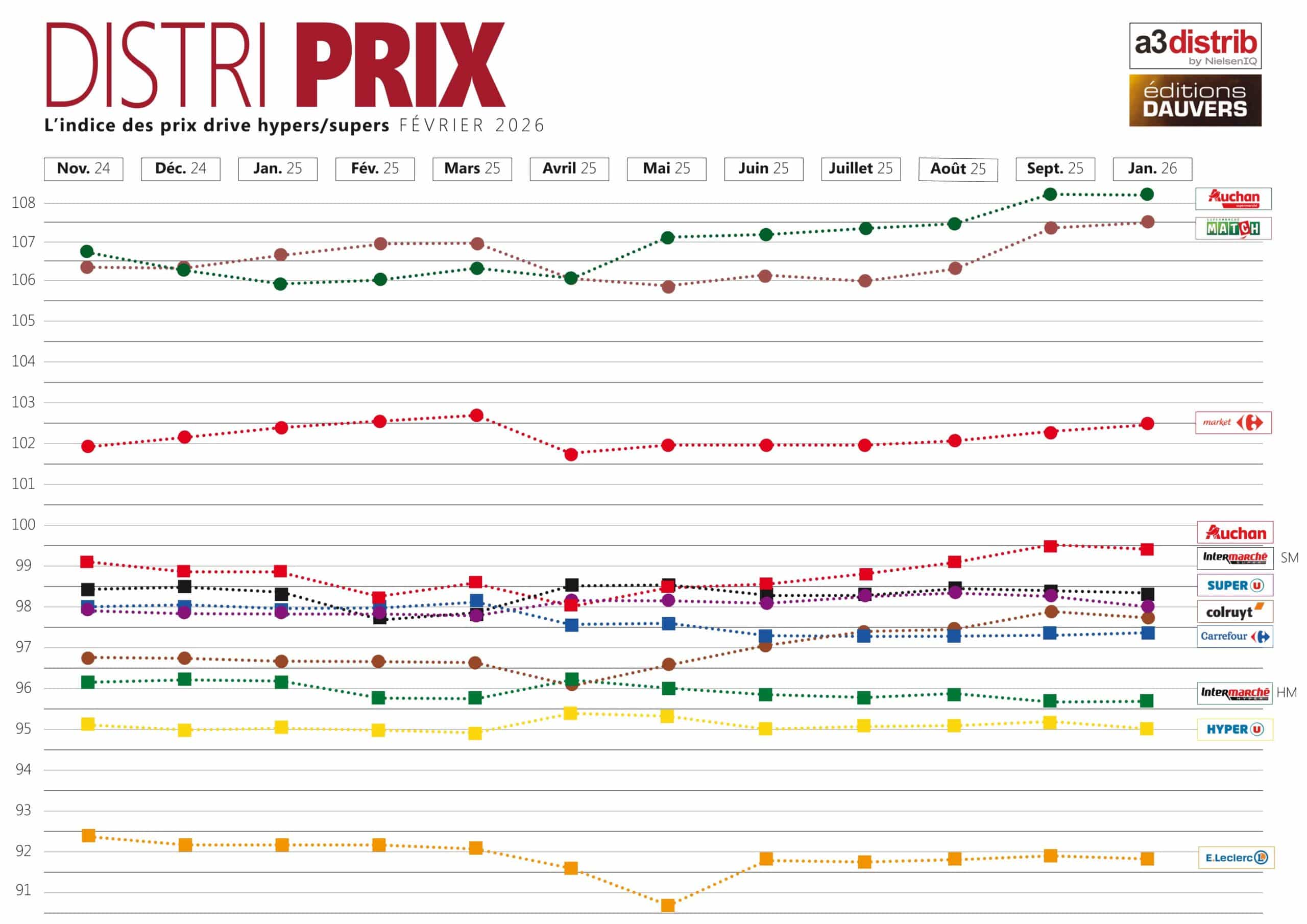 Nouvelle livraison de l’indice DISTRI PRIX (A3 Distrib / Ed. Dauvers) sur la base des prix observés en drives en janvier. Comme le mois précédent, peu d’évolutions, les positions restent inchangées dans l’ordre des enseignes. Dans le détail, les écarts sont modestes : de 0,1 ou 0,2 pt pour l’essentiel des enseignes. Exemple Leclerc : indice en amélioration de 0,1 pt, l’exact inverse de décembre.