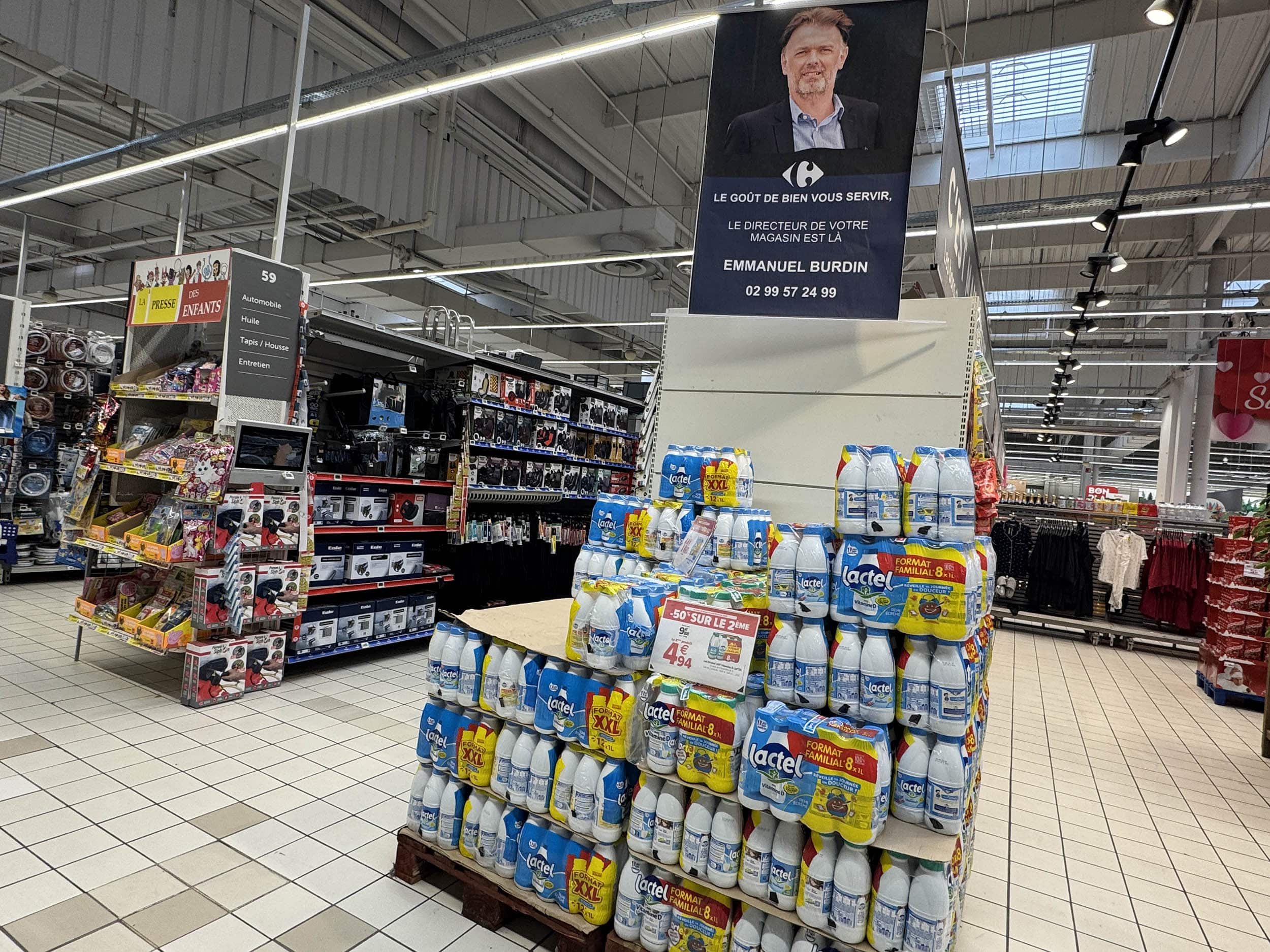 Le Carrefour de Mamie Dauvers à Rennes Cesson (35). Dès l’entrée, l’affiche XXL : « Le directeur de votre magasin est là ». Caché dans la TG Lactel ?