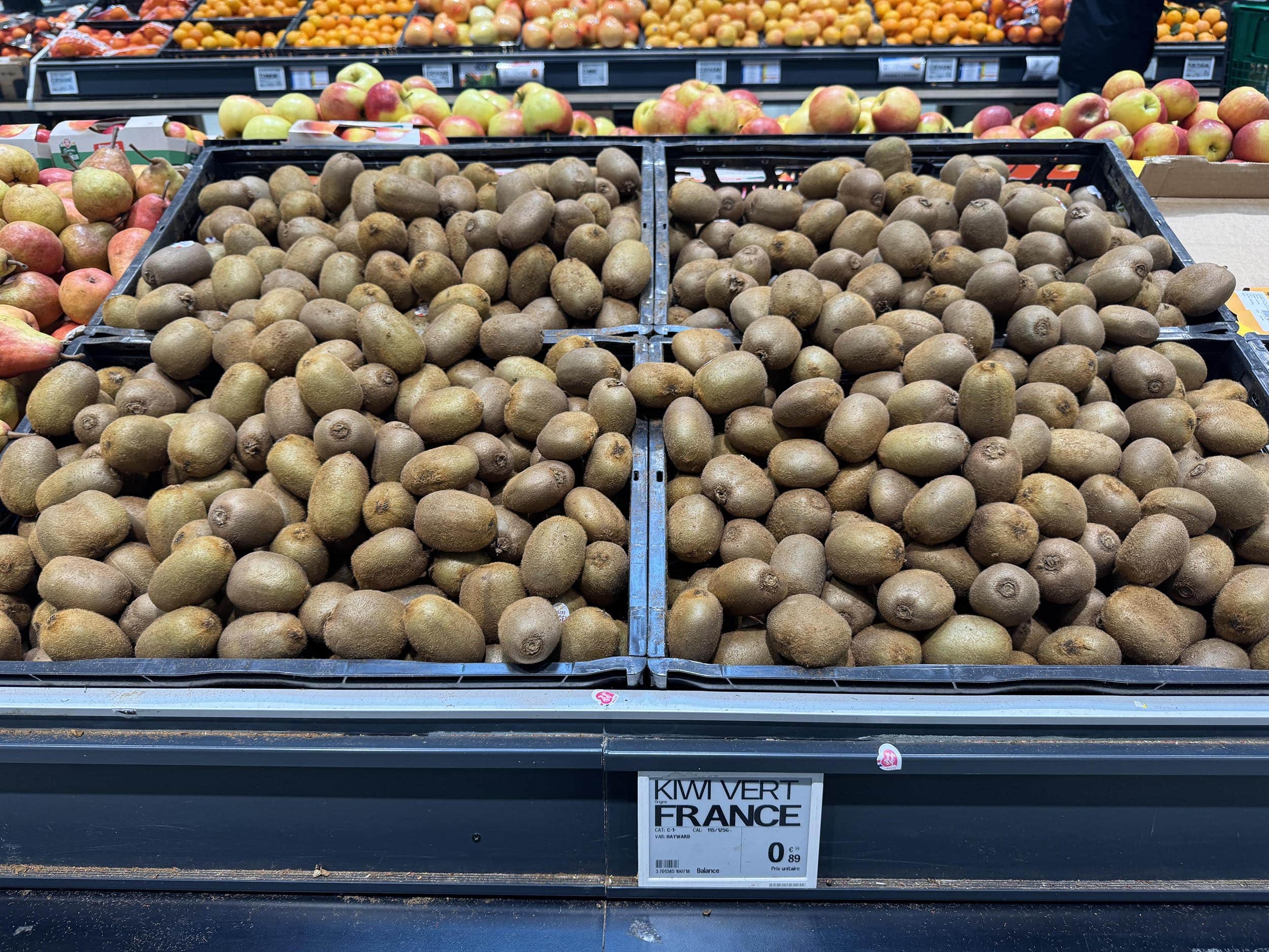 J’ai suffisamment encensé l’hyper (revoir ici) pour être critique sur le prix des fruits et légumes. Indigne de la promesse d’enseigne. Les kiwis ? 89 centimes. 30 centimes au-delà du prix national Carrefour. Je sais, ça pique 🌶️.