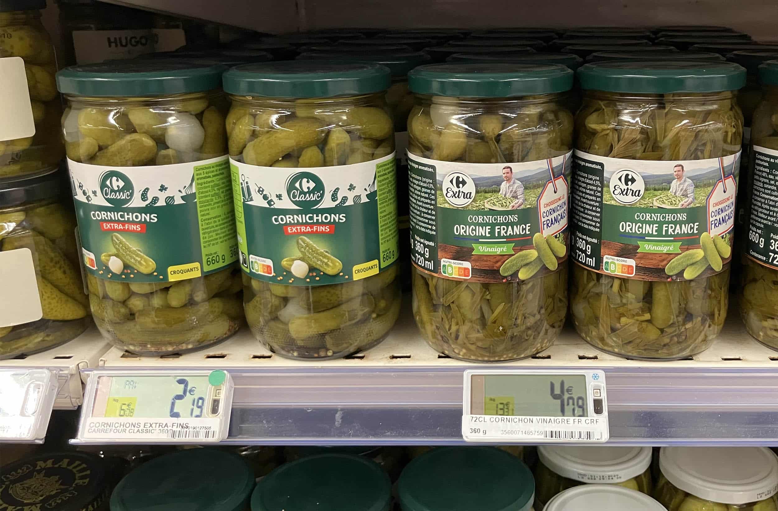 Le prix de l’origine France ? Deux fois plus cher : 4,79 € vs 2,19 €. Pour aider à vendre la version française ? Que soit indiquée tout aussi clairement la provenance du cornichon « anonyme ». Indien peut-être ? Carrefour, on fonce sur Origin’Info ? La défense des producteurs français, ça doit être des actes plus que des mots (même doux).