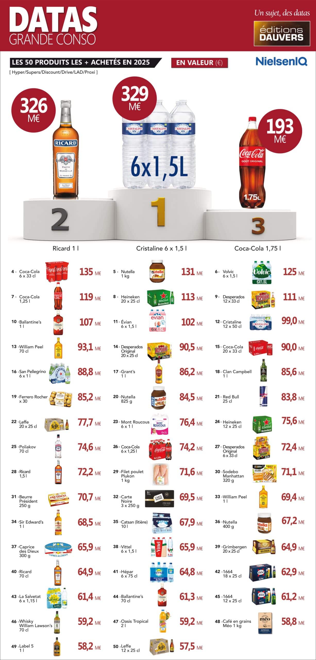 L’ensemble de ce Top 50 pèse plus de 4,5 milliards d’euros dépensés chaque année. Énorme ! En apparence, les classements volumes et valeur se ressemblent. Sur la plus haute marche du podium dans les deux cas : le pack de 6 Cristaline. En valeur, Cristaline détrône la bouteille d’un litre de Ricard, encore leader en 2024 (voir ici). L’écart est mince, 3 M€, mais le symbole est là : Cristaline est bien le premier produit vendu, quel que soit le prisme de lecture !