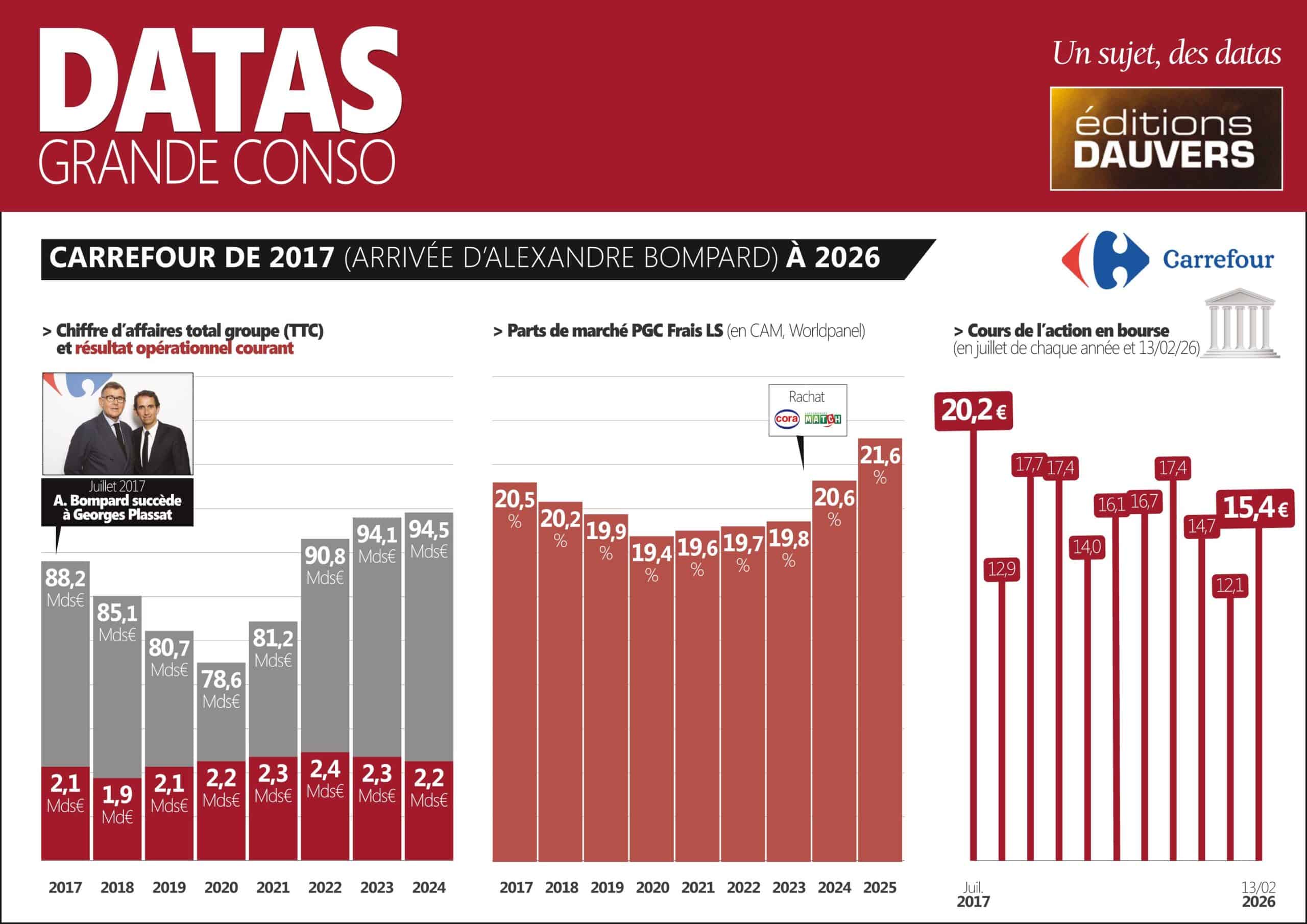 Semaine d’actu intense pour Carrefour. Demain mardi, en fin d’après-midi, le groupe publiera ses résultats 2025. Et mercredi, dans la matinée, présentation au siège de Massy du nouveau plan stratégique de Carrefour pour les prochaines années, quelques mois après la reconduction d’Alexandre Bompard à sa tête. L’occasion, évidemment, d’un bilan version infographie.
