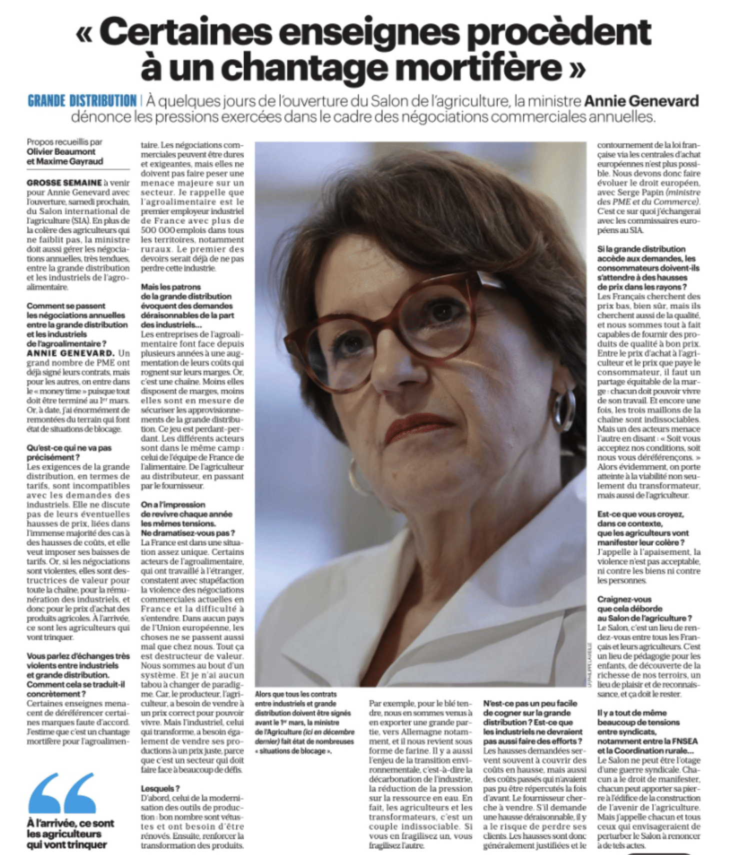 Encore une journée “classique” de la période de négociations commerciales… Ce matin, à 15 jours de la clôture des négos, la ministre de l’Agriculture, Annie Genevard, y va de ses remontrances à la distribution dans Le Parisien. “Certaines enseignes procèdent à un chantage mortifère” titre le quotidien. Sans nommer quiconque, la Ministre taille les enseignes, accusées de tous les maux ou presque. “Chantage” donc, mais aussi “blocage”, “menaces de déréférencement” et j’en passe. Au passage, Annie Genevard, légitime en creux les demandes de hausses de tarif : “Les hausses sont donc généralement justifiées“, explique-t-elle.
