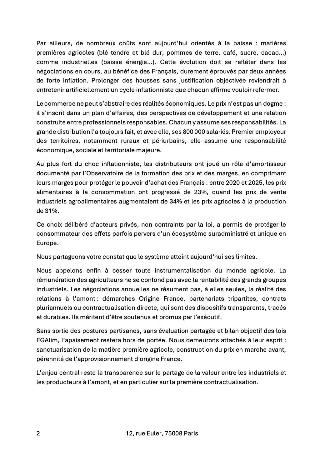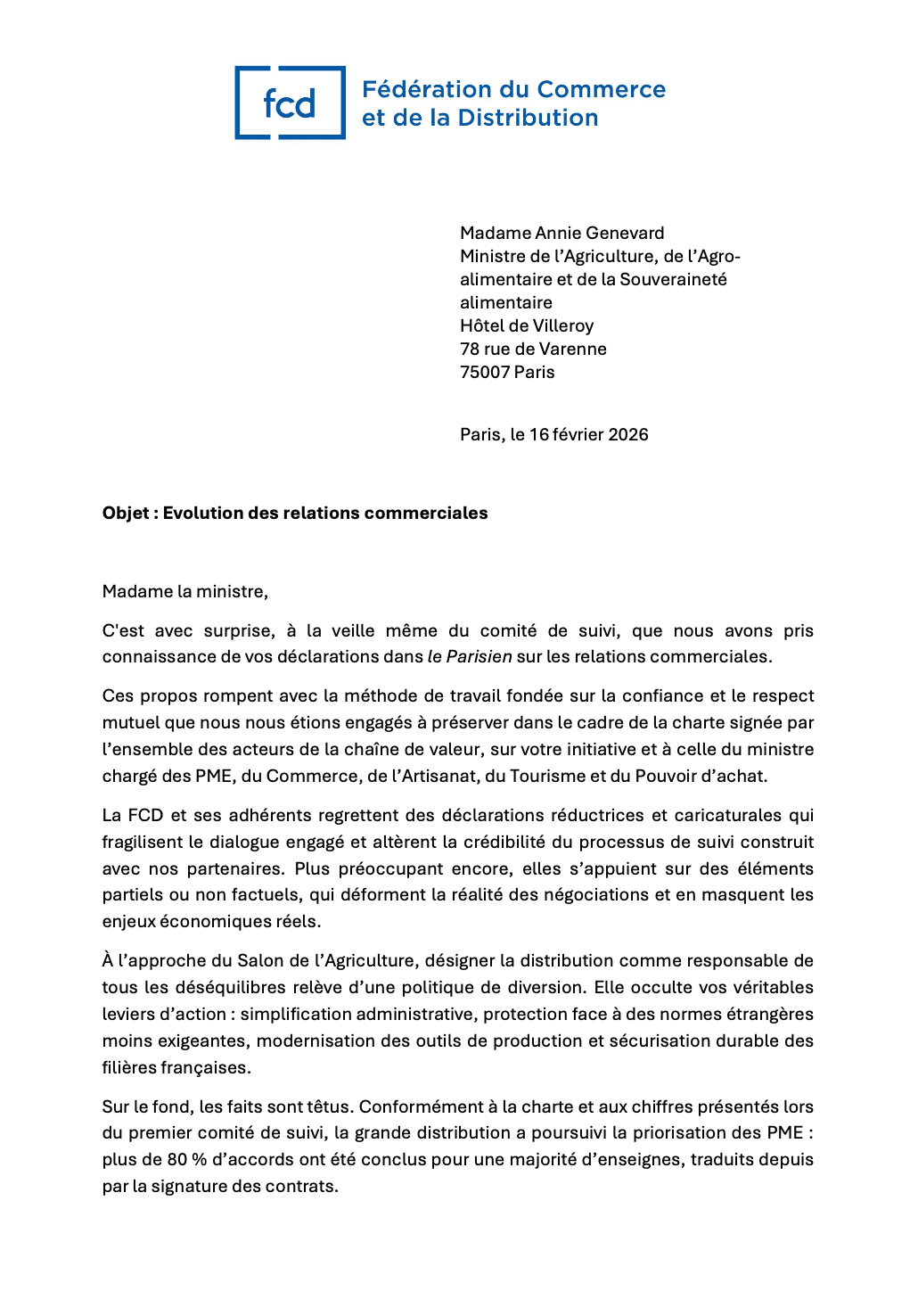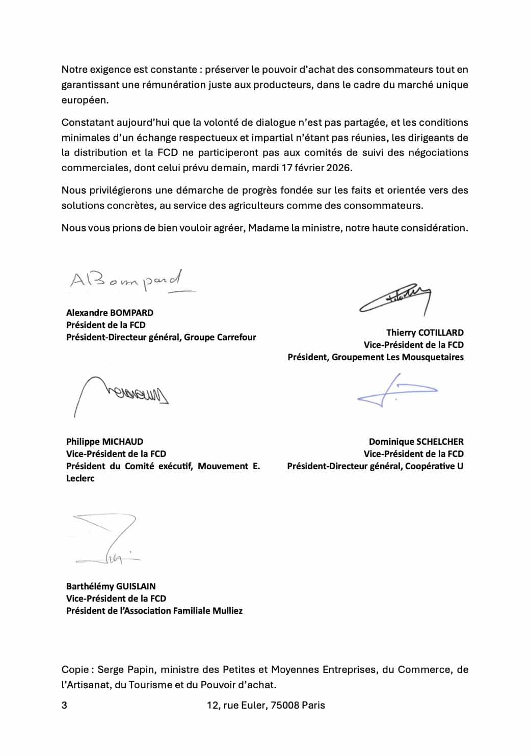 Il n’en fallait pas davantage pour agacer les enseignes et leur fédération, la FCD. Ce soir, la réponse du berger à la bergère : un courrier signé du président de la FCD, Alexandre Bompard, et de ses vice-présidents (Thierry Cotillard, Dominique Schelcher, Philippe Michaud et Barthélémy Guislain). Le courrier, que je reproduis ici, est assez direct (euphémisme). Les distributeurs reprochant d’entrée à la Ministre de rompre “avec la méthode de travail fondée sur la confiance et le respect mutuel que nous nous étions engagés à préserver dans le cadre de la charte signée par l’ensemble des acteurs de la chaîne de valeur, sur votre initiative“. La fameuse charte… Charte dont je dis depuis l’origine qu’elle ne changera rien. La preuve, une nouvelle fois…