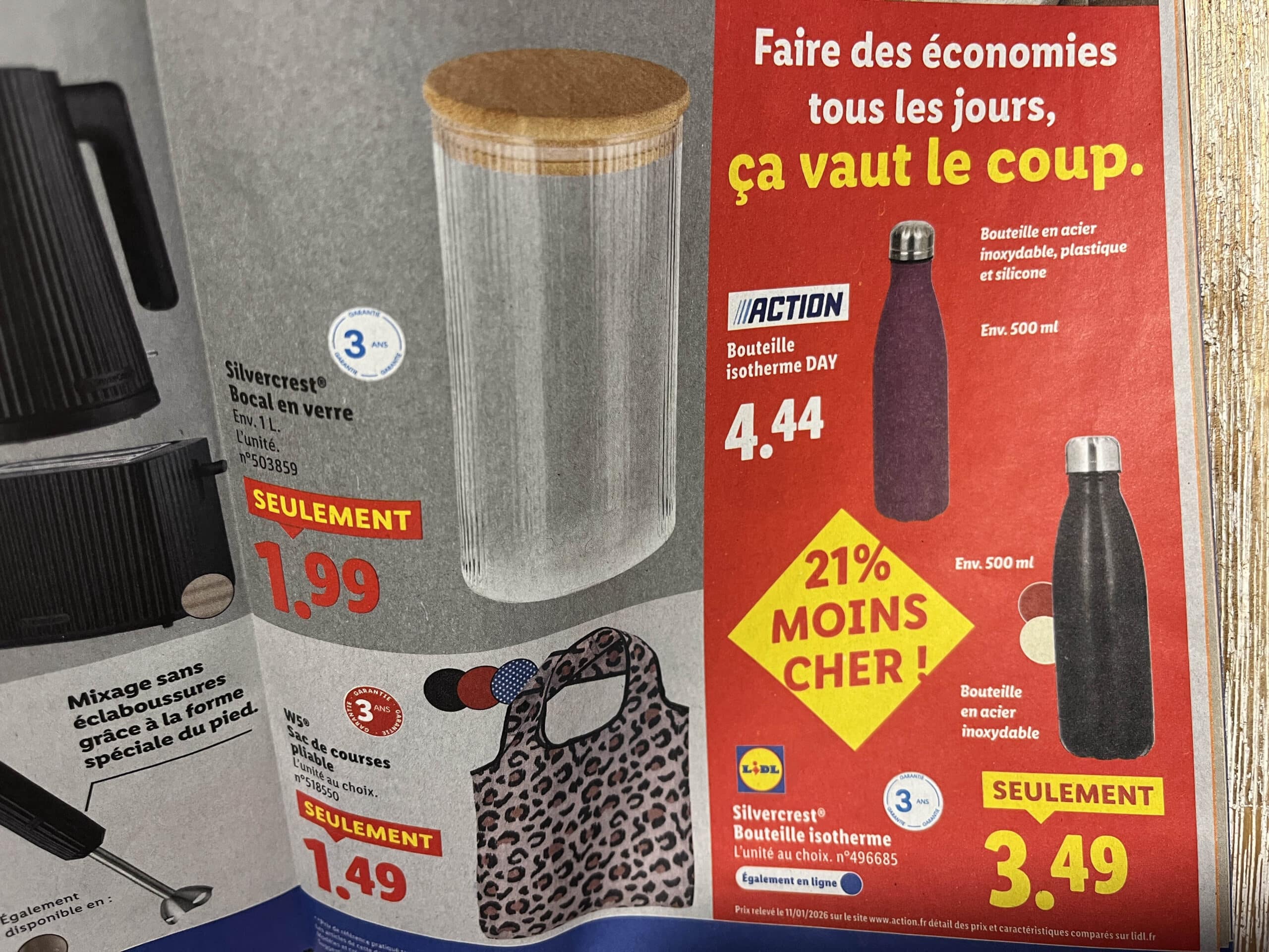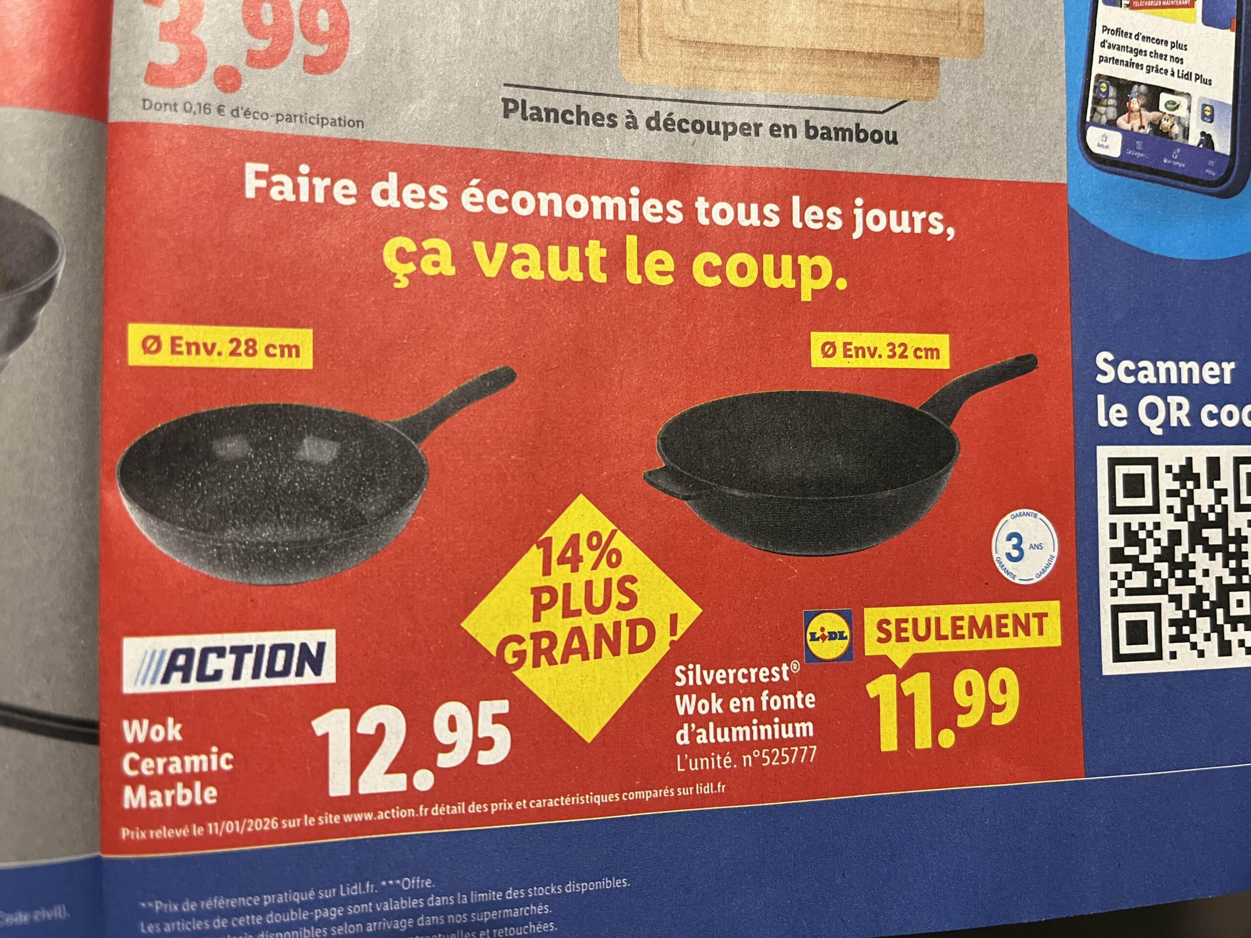 Action, nouveau faire-valoir de Lidl pour améliorer son image-prix ? Visiblement oui ! Dans son prospectus en cours, le discounter allemand s’attaque frontalement au discounter néerlandais. Un produit, un prix et bim, Lidl se paye Action. Parfois même avec un “plus” produit comme dans le cas du wok. Bref, ça castagne !