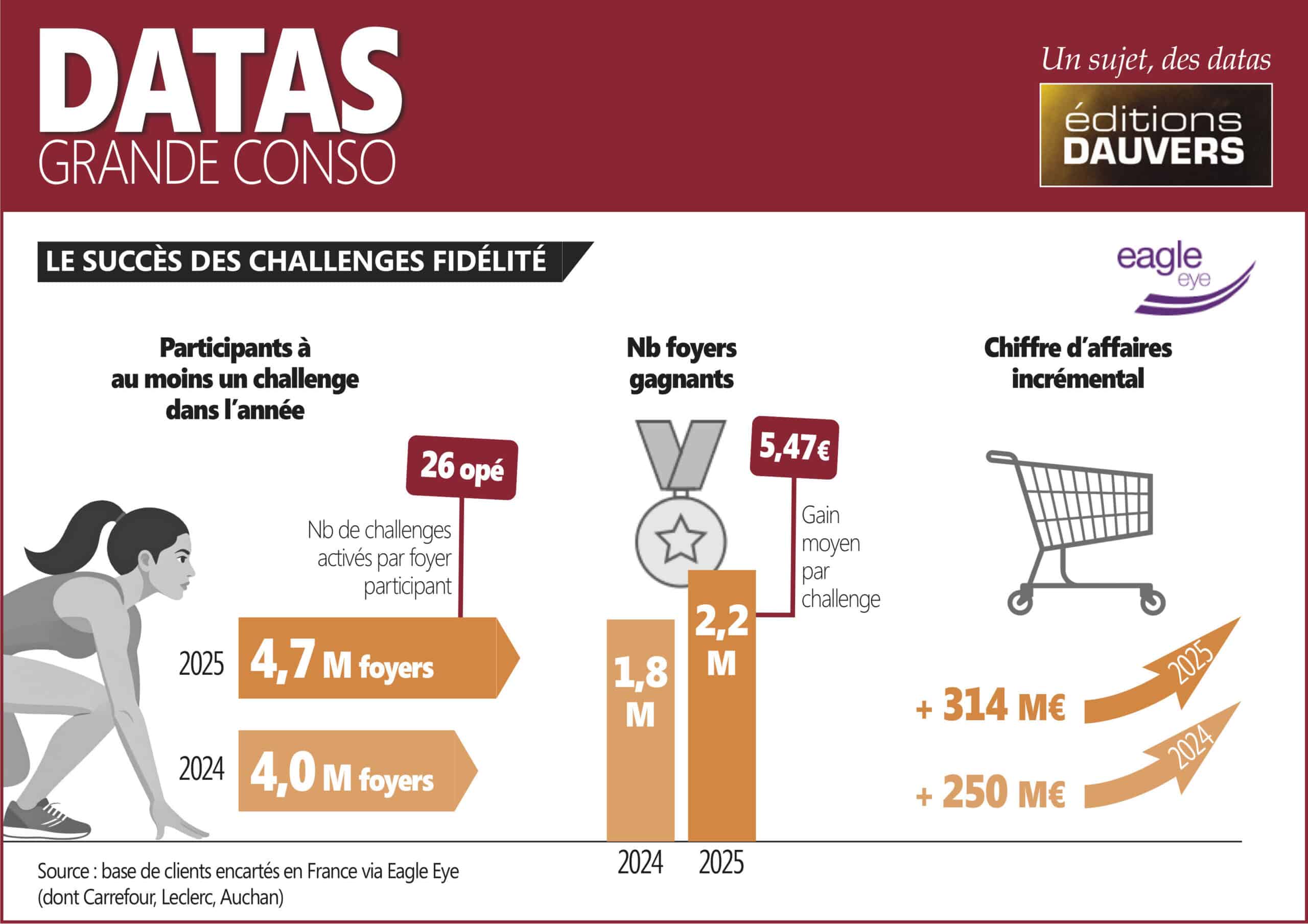 C’est une évidence : la personnalisation croissante des défis proposés aux clients encartés les incite davantage à se prendre au jeu. Eagle Eye a recensé 4,7 millions de foyers participants l’an dernier, qui ont activé en moyenne 26 challenges. Ils étaient moins nombreux en 2024 (4 millions) et ils avaient activé moins de défis (21 en moyenne).