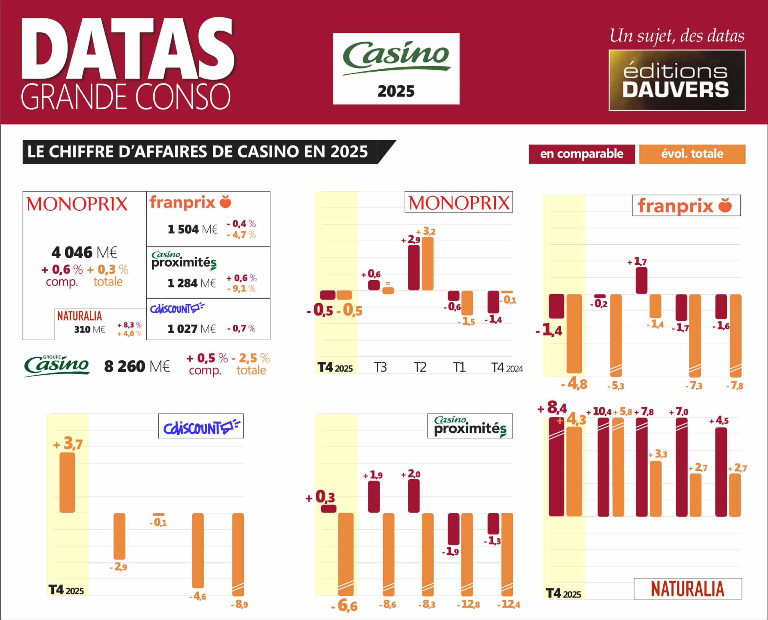 Même s’il y a quelques bonnes nouvelles : Naturalia surfe sur le retour en grâce des réseaux bio spécialisés et, moins attendu, Cdiscount est un peu revigoré. 2 millions de clients gagnés en 2025 et un CA en hausse (+ 3,7 %) au 4e trimestre. Une première depuis 4 ans. Ce n’est certes pas ça qui sauvera Casino, mais toutes les éclaircies sont bienvenues après la tempête !