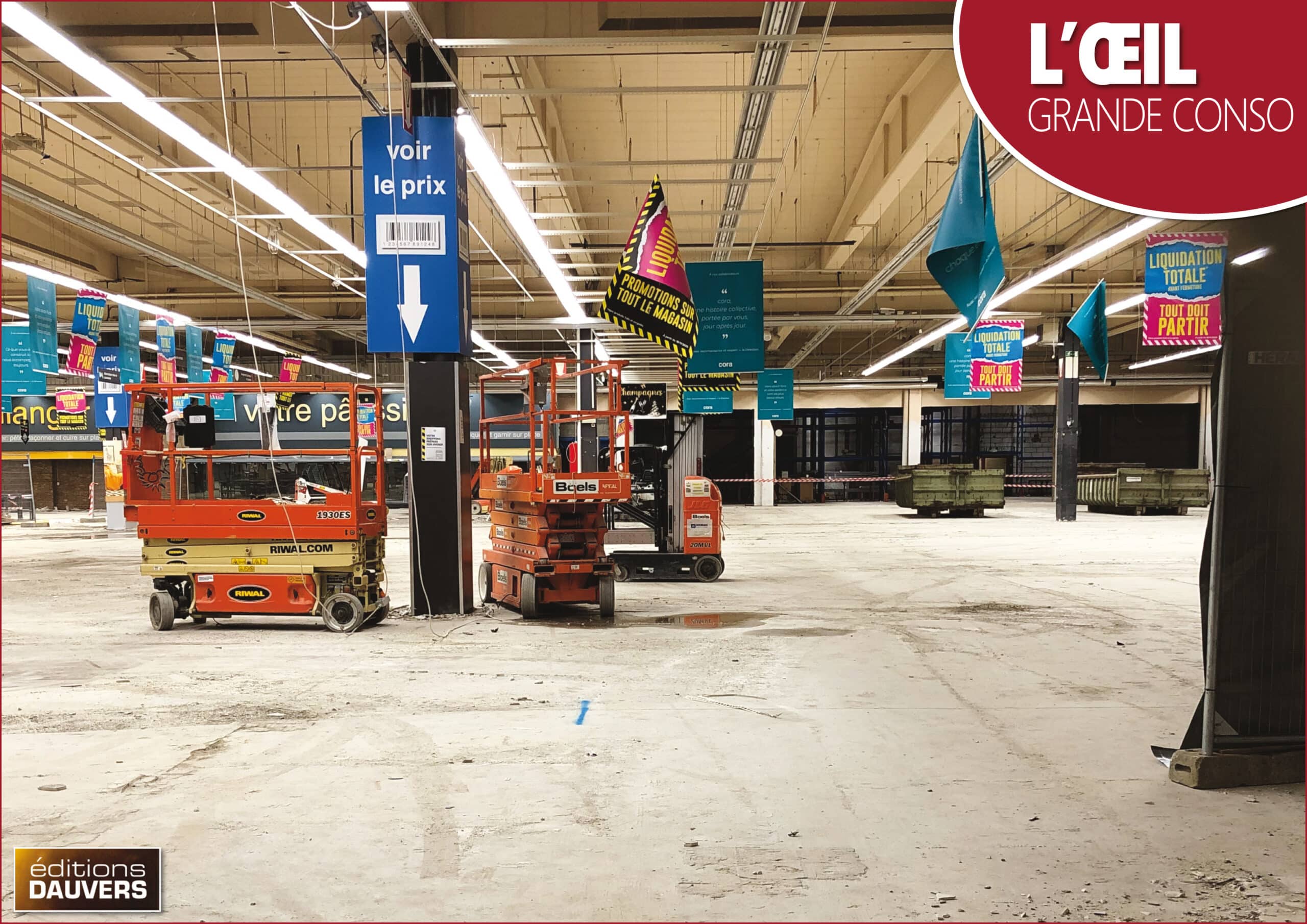 Parce que c’est aussi ça la vie du commerce, retour à Châtealineau (Belgique) près d’un mois après la fermeture de Cora. Comme les 6 autres hypers de l’enseigne (revoir ici), Cora Châtelineau n’a pas trouvé preneur en l’état et a baissé le rideau. Terrible résumé de l’époque où s’opposent ralentissement de la conso et surcapacité commerciale. Terrible image où, décarrelé, l’hyper disparaît peu à peu. Seul stigmates : quelques affiches rappelant la “liquidation totale”.