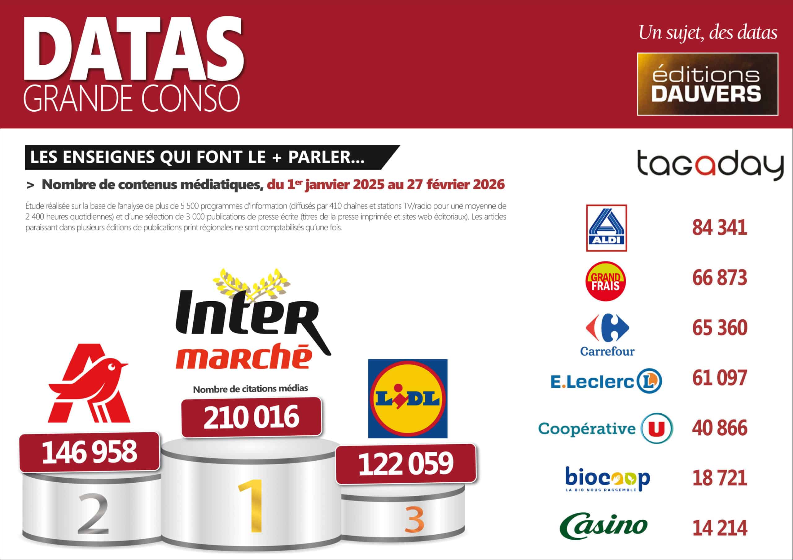 Quelle enseigne est la star des médias ? La réponse, selon l’étude Tagaday que je révèle en exclusivité, ne souffre d’aucune contestation. Intermarche plie le match avec plus de 210 000 contenus médiatiques en 14 mois, du 1er janvier 2025 au 27 février 2026 (excusez pour la fraîcheur 😂). Le loup, star du film de Noël de l’enseigne y a évidemment contribué, mais il n’explique pas tout. En 2023 déjà, lors de la première vague de l’étude, Intermarché pointait sur la seconde marche du podium.