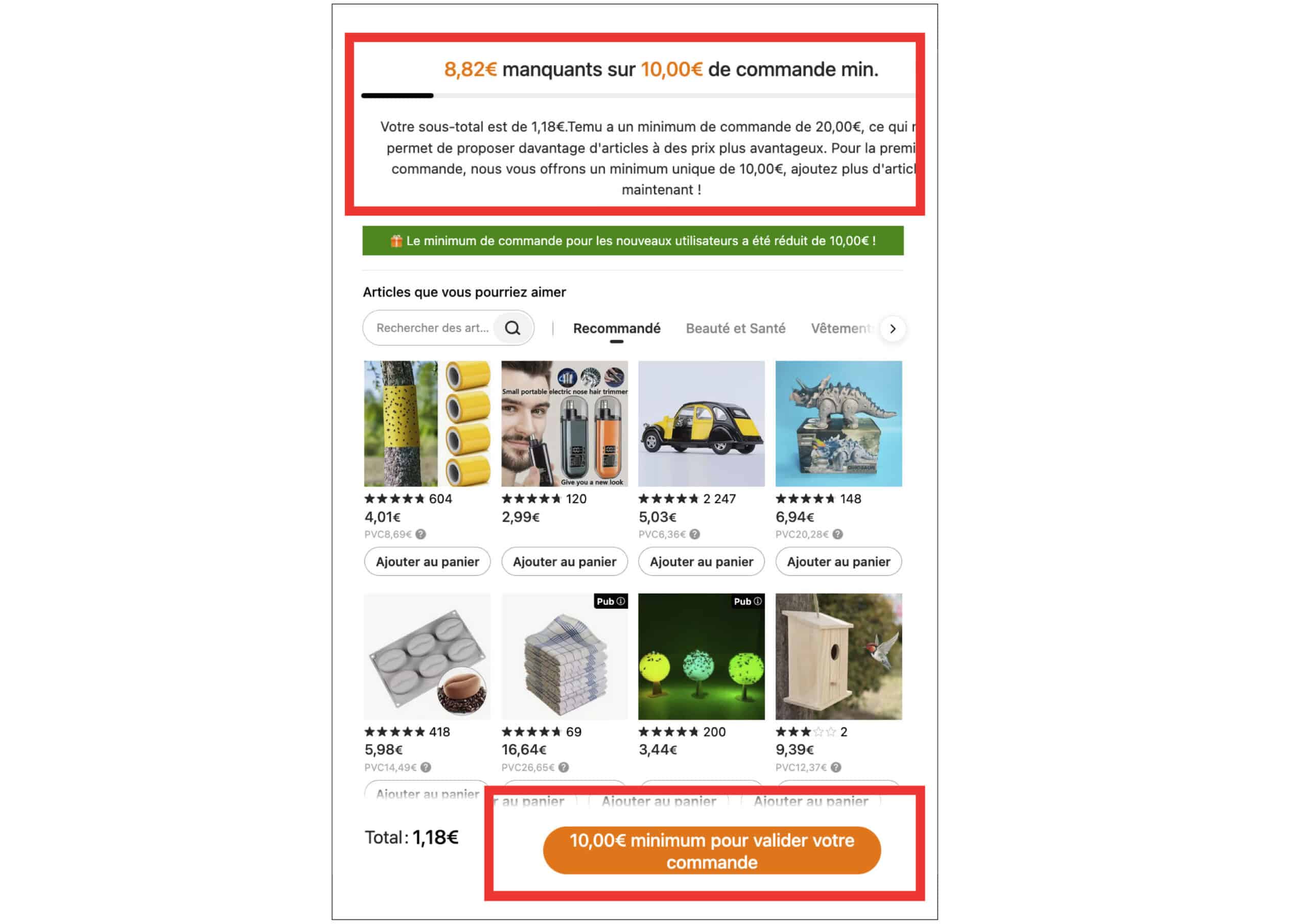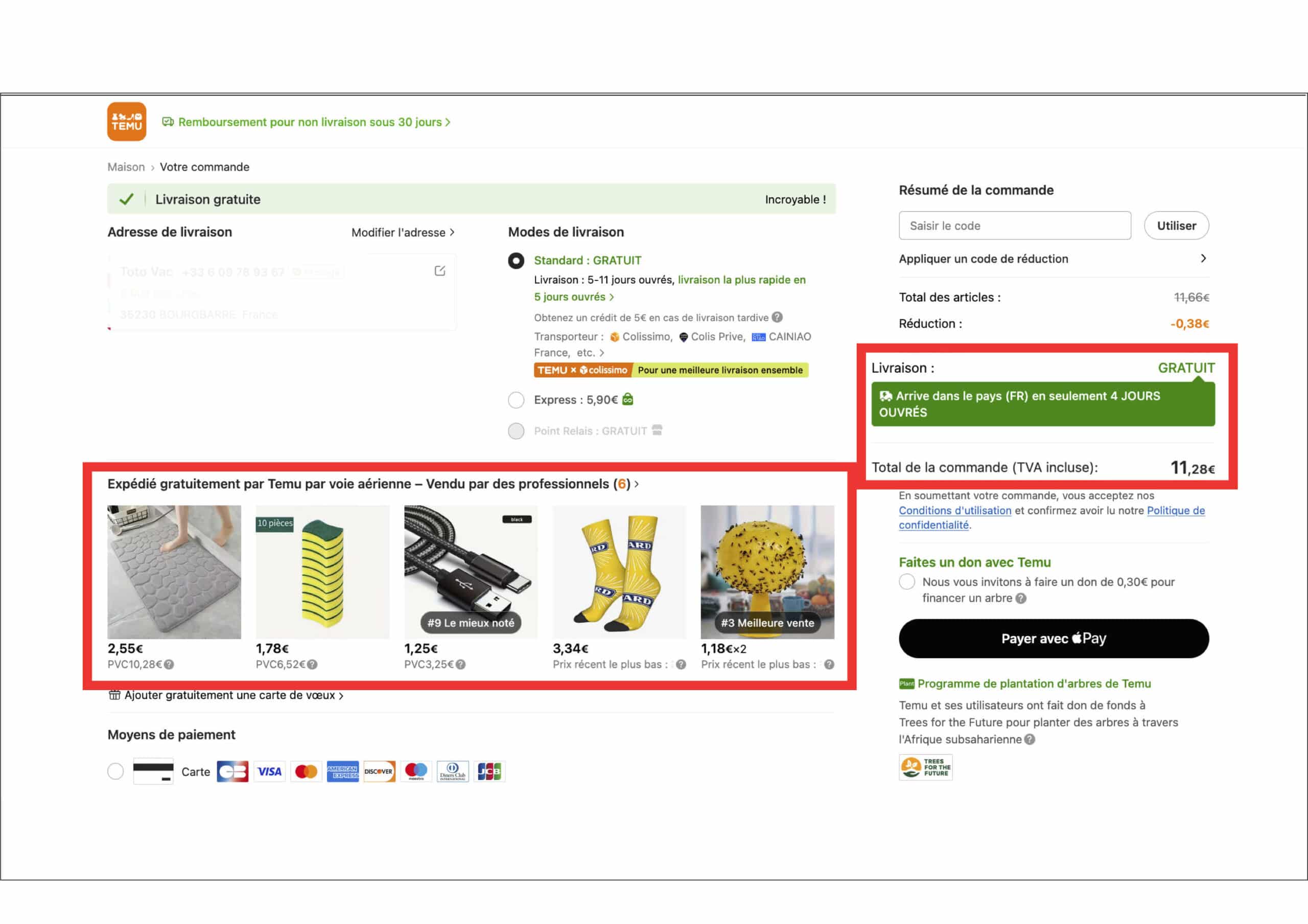 Last but not least, outre des délais logiquement raccourcis de 2 ou 3 jours, les conditions de livraison sont différentes pour les commandes « entrepôt local » : il faut payer 2,99 € de frais, si la commande n’atteint pas 30 €. Vous avez bien lu : c’est gratuit en livraison par avion de Chine mais payant en « local ». Pas très intuitif pour le client… Même si Temu n’impose alors plus de minimum de panier.
