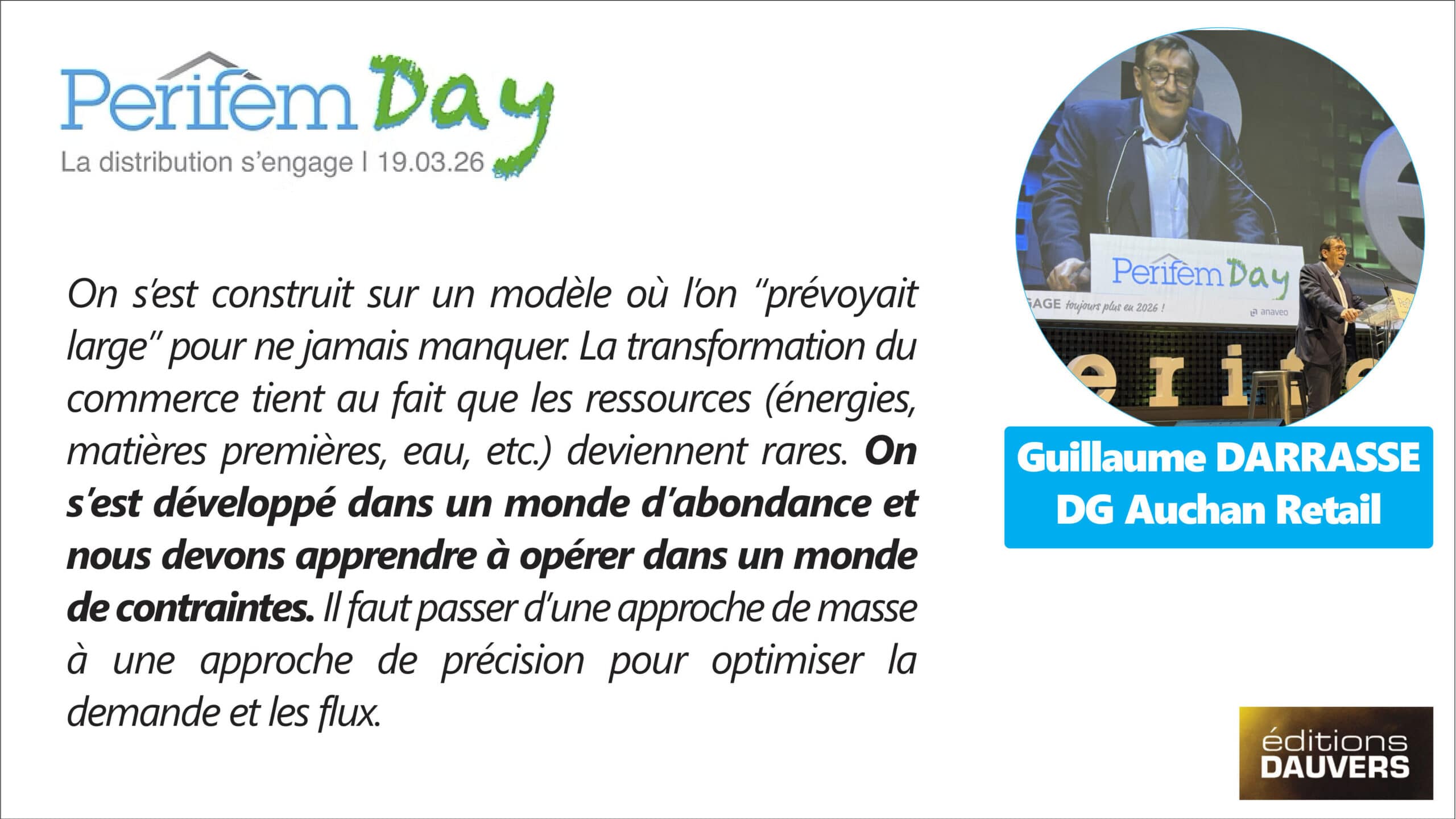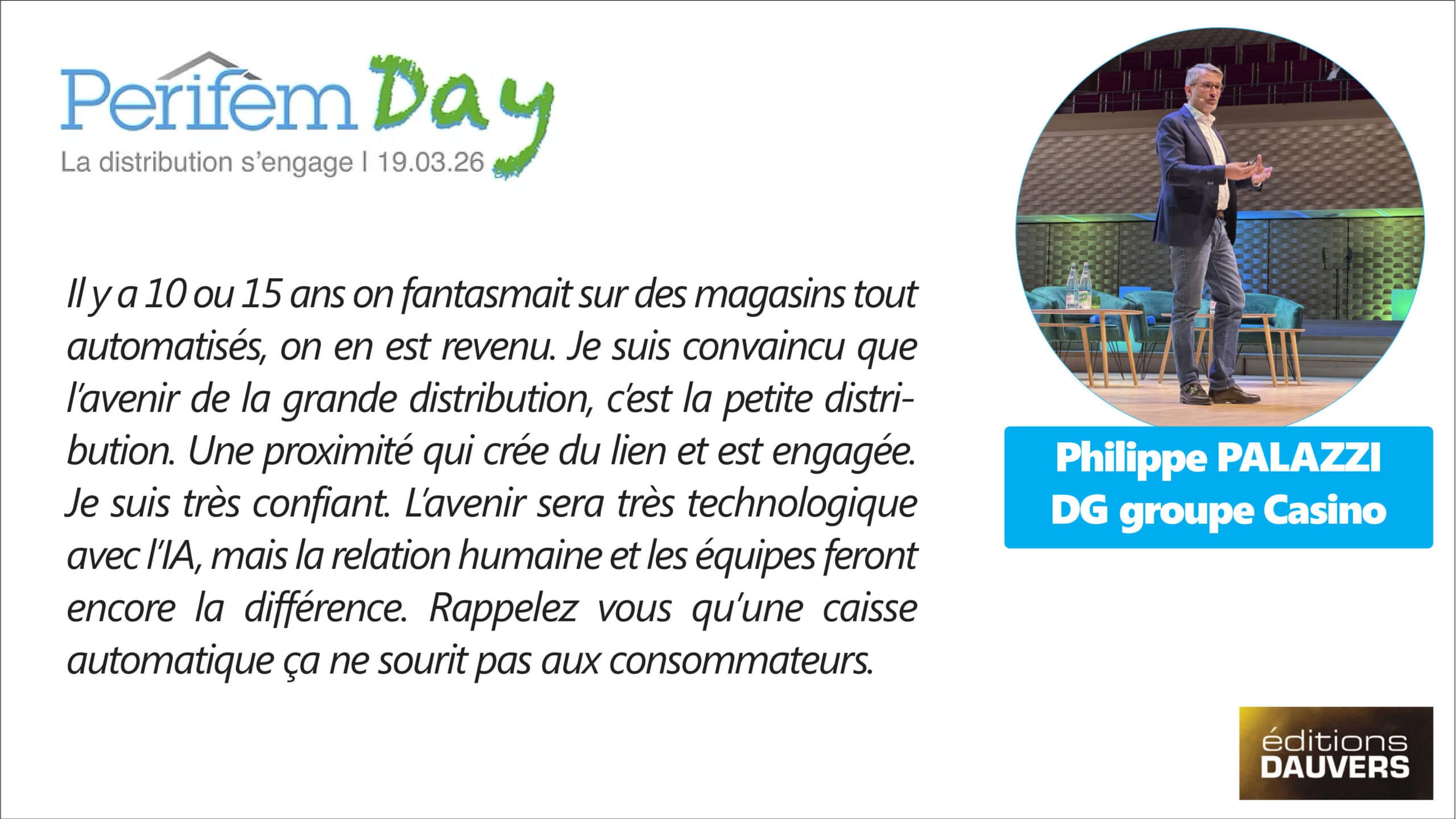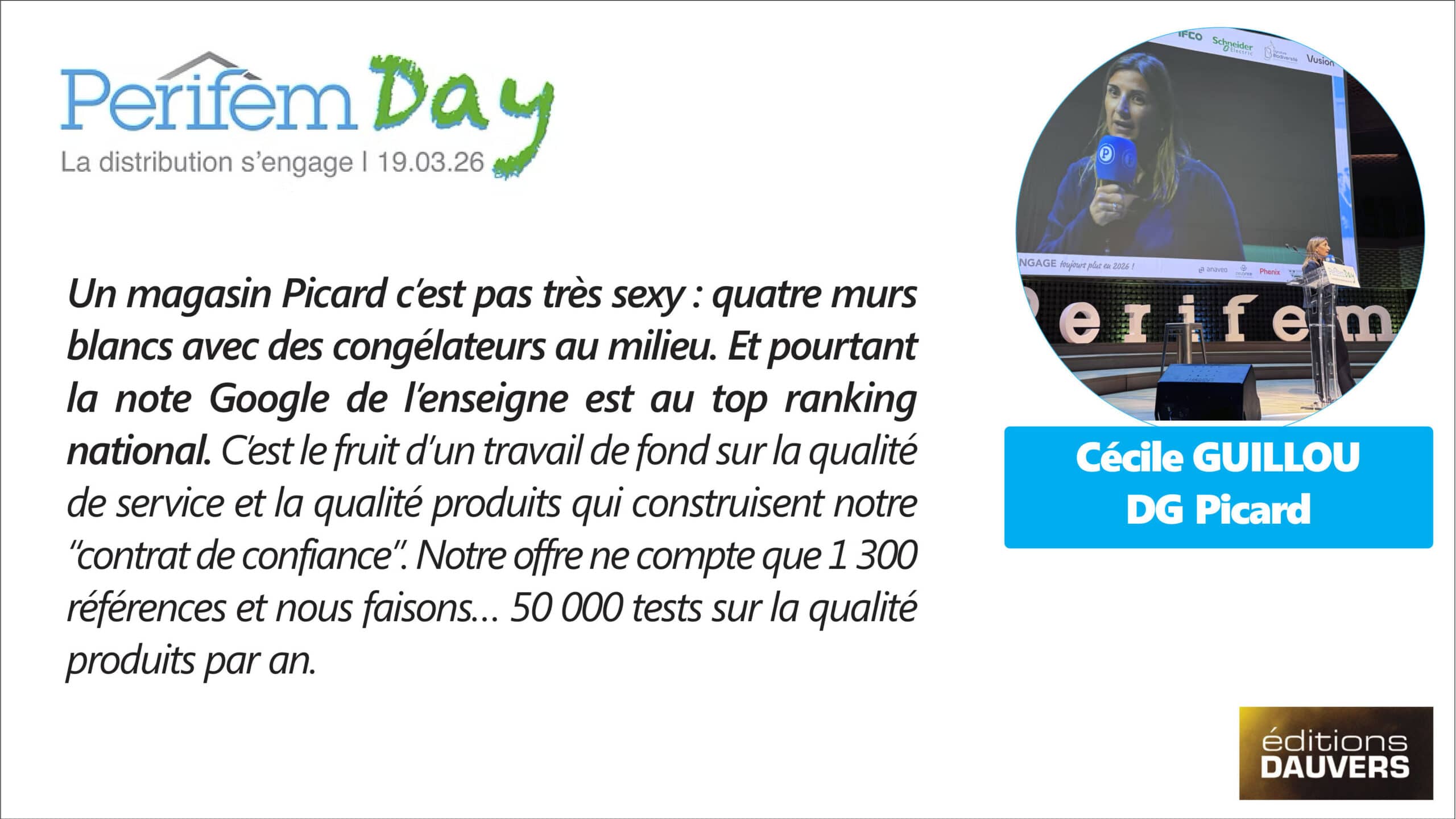 Perifem, la Fédération Technique du Commerce, c’est l’association « technique » du commerce qui fédère les distributeurs autours des sujets d’environnement, d’énergie et d’innovation techno. C’était aujourd’hui la grand messe annuelle de l’association, le 7e Perifem Day. Pour ceux qui n’avaient pas la chance d’y être, quelques verbatims des (nombreux) patrons présents et infos clés en infographie.