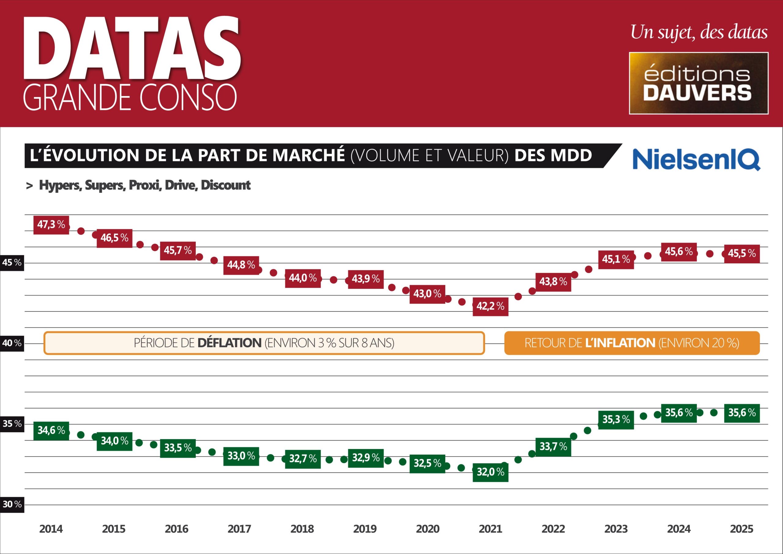 Carrefour a entamé la célébration des 50 ans de ses produits libres (j’y reviens demain). L’occasion d’un retour en arrière sur l’évolution des MDD depuis plus de 10 ans, calculées par NielsenIQ. Et la démonstration qu’au-delà des efforts des enseignes (Carrefour et les autres), la performance des MDD est “drivée” par le niveau d’inflation, donc par les contraintes économiques subies par les clients. La corrélation est en effet nette entre la longue déflation jusqu’en 2021 et le reflux des MDD. Logique… En relatif (vs l’inflation générale et le pouvoir d’achat), les marques nationales sont devenues plus attractives. Donc… préférées. A l’inverse, dès le redémarrage (violent) de l’inflation en 2022, les MDD ont soudainement regagné en intérêt aux yeux des clients. En creux (et en forçant un peu j’en conviens), les MDD sont une forme de “marques par défaut” : moins attirantes quand les temps sont favorables, choisies comme un refuge quand les temps sont durs.