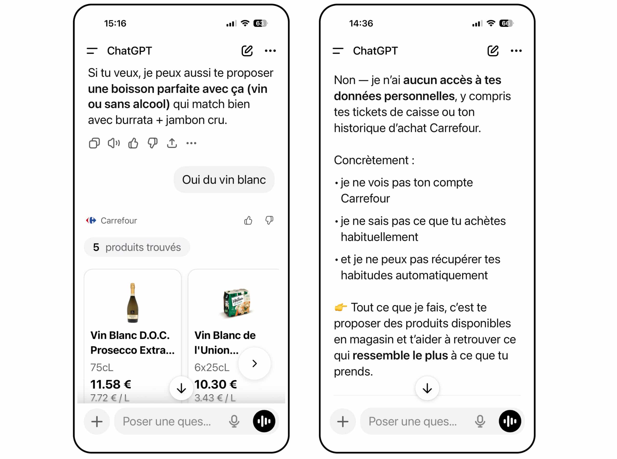 Pour l’instant, ChatGPT n’a pas accès aux données personnelles du client ni à son historique chez Carrefour. Vu du consommateur, la connexion entre les deux comptes réclamée en début de parcours n’a donc pas de sens puisqu’elle ne débouche sur aucun conseil personnalisé. Mais cette étanchéité ne pourra que disparaître avec le temps, la personnalisation étant appelée à devenir très vite un élément fondamental de la relation commerciale. Ce qui n’est guère rassurant pour les enseignes…