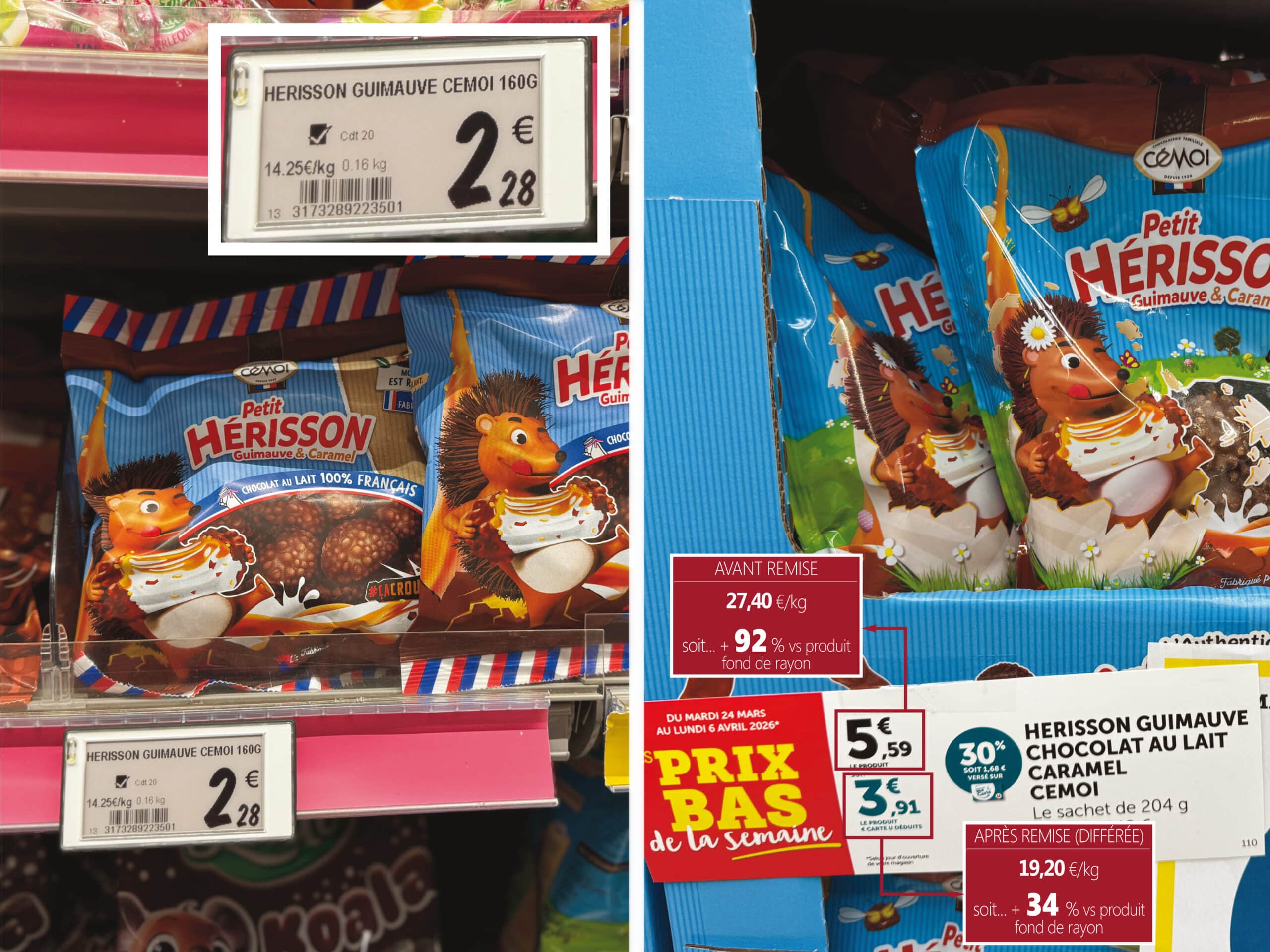 En bonne place, dans l’allée centrale (parce que c’est le catalogue de la semaine), voilà les petits hérissons en promo. Les goûts et les couleurs ne se discutant pas (sinon Mamie Dauvers et moi serions déjà condamnés à perpet’), va donc pour un sachet à – 30 %. Une belle remise mais… sur un prix exorbitant : 5,59 € les 204 g, alors que le sachet habituel de 160 g en fond de rayon est par ailleurs toujours à son prix habituel : 2,28 €. Si je résume : Cémoi ou U ou les deux ont donc gonflé le prix de 92 % pour ensuite m’offrir royalement 30 % en différé. Là, je dois reconnaître qu’en matière de “fausse promo”, on est pas loin d’un champion. Suis à deux doigts de rebaptiser la technique… “le coup du hérisson”. Et tant pis si… ça pique 🌶️🌶️🌶️. Vous lavez bien sûr.