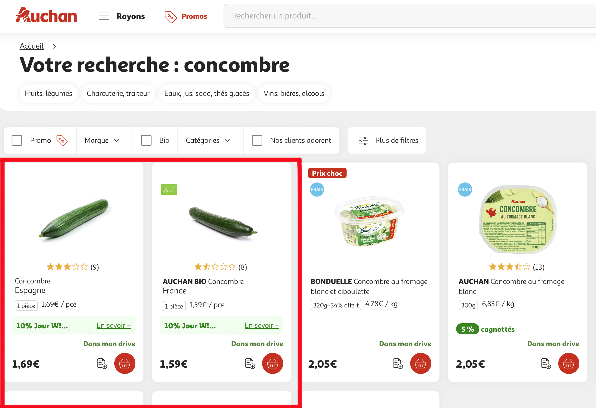 Quelques courses sur Auchan Drive. Juste pour le plaisir de payer plus cher, j’vais choisir le concombre non bio ET espagnol.