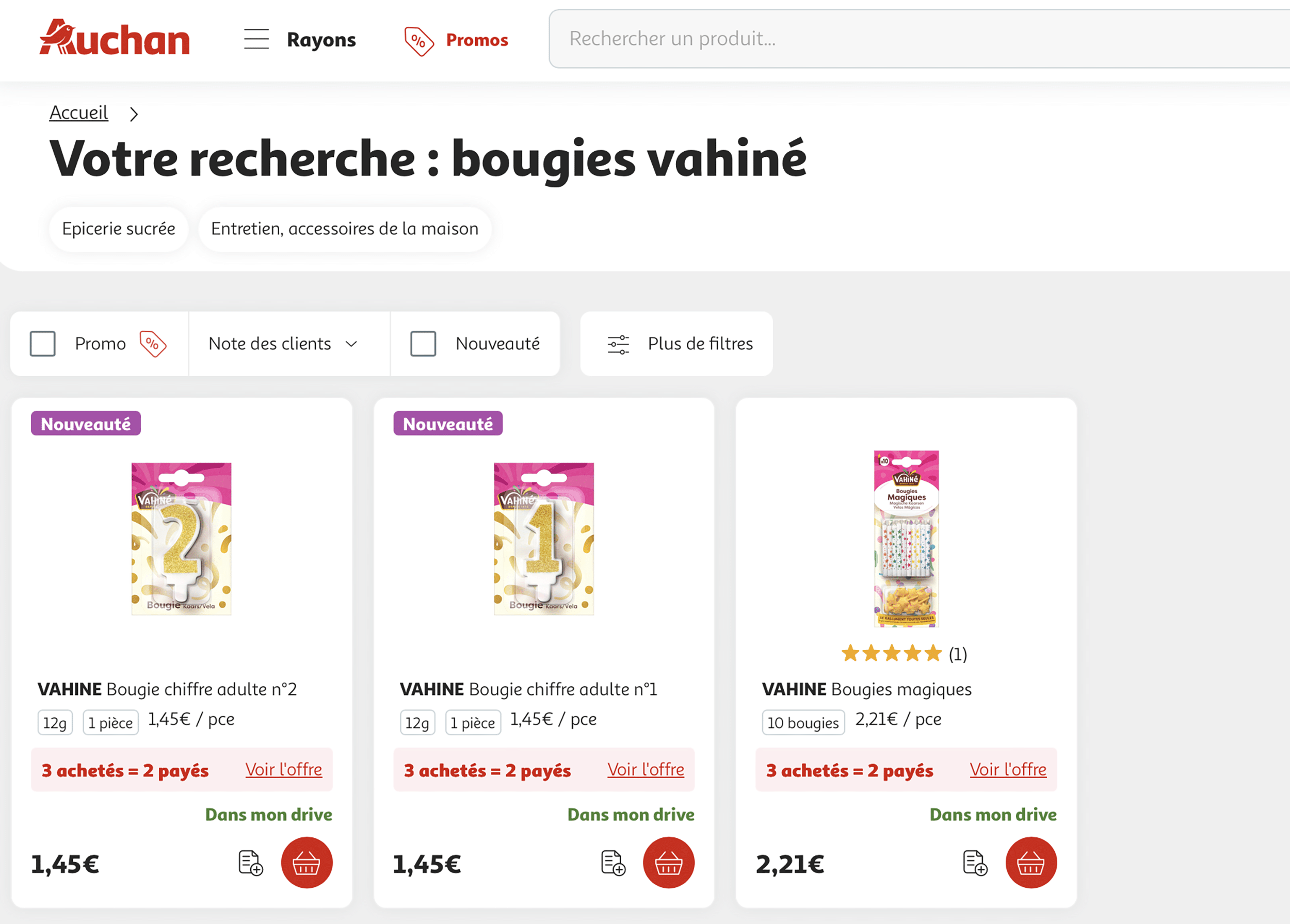 Les bougies d’anniversaire chez Auchan en “2+1” (3 achetées = 2 payées). Donc pour des anniversaires à trois chiffres… Auchan, n°1 sur le grand âge ! Vous lavez bien sûr.