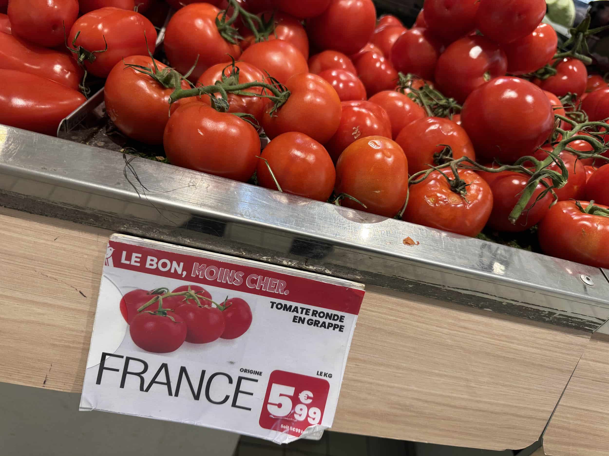 Auchan Jouy-en-Josas (78). Les tomates en promo à 5,99 €/kg. Va falloir revoir le slogan, amis d’Auchan… « Le bon, plus cher ».