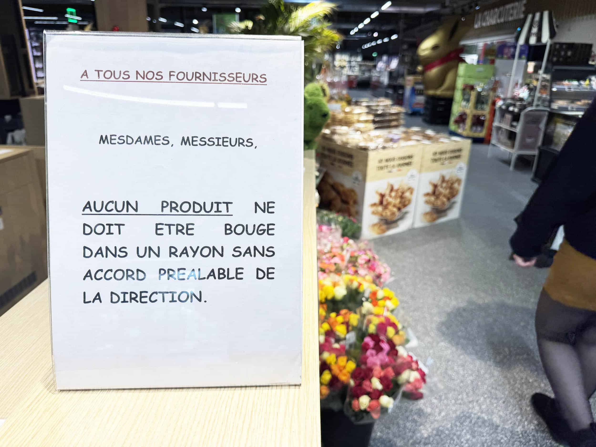 Encore en Essonne ! Intermarché Chilly-Mazarin. « À tous nos fournisseurs. Aucun produit ne doit être bougé dans un rayon sans accord préalable de la direction ». Quoi ??? Les commerciaux modifieraient les implantations ??? Non, je n’y crois pas 🤣.
