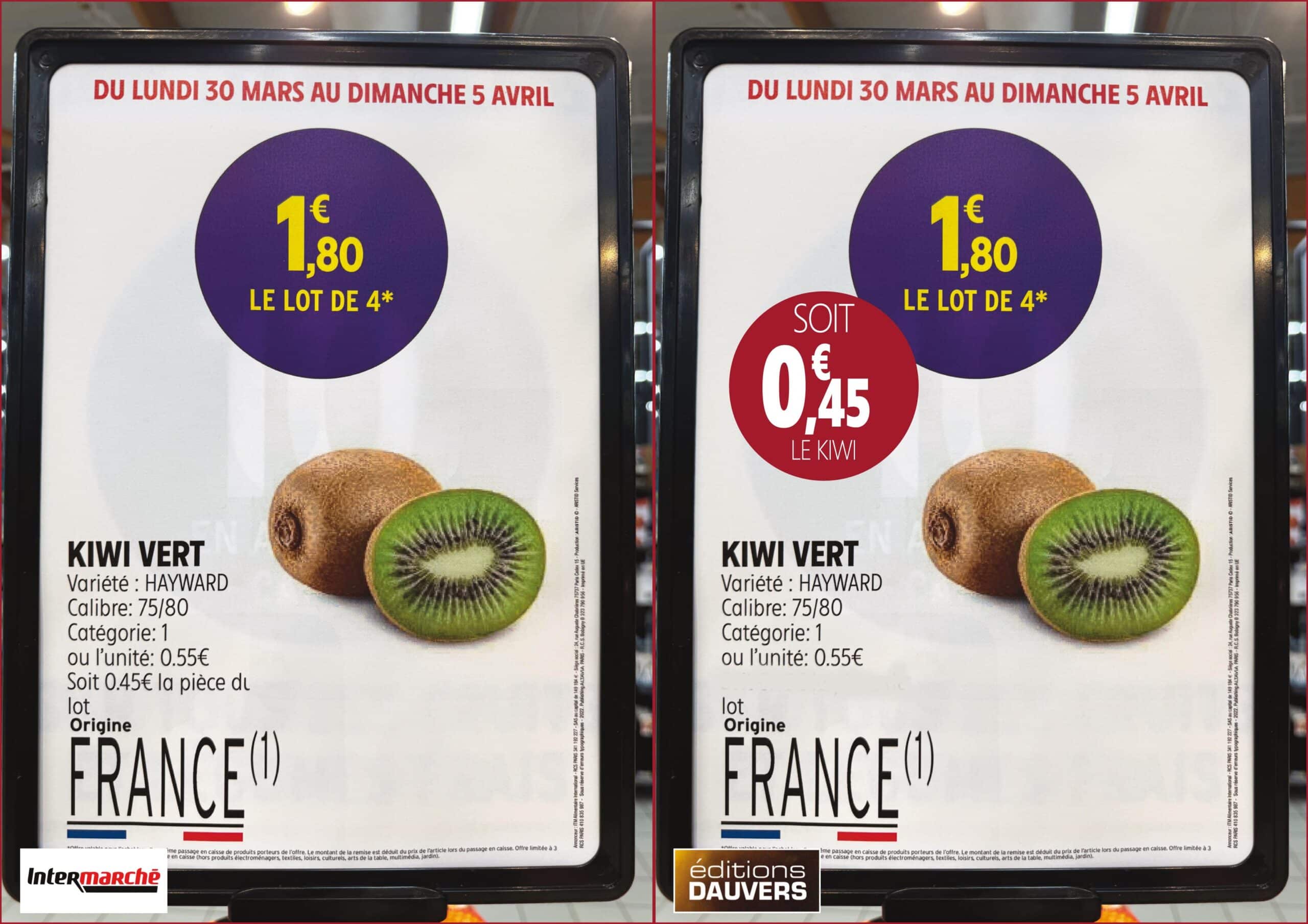 Vous allez me croire obsédé par les kiwis (revoir ici). C’est pas faux, mais… c’est pas le sujet ! Le sujet, aujourd’hui (en ce dernier jour de promo chez Intermarché), c’est la qualité de l’affichage. A gauche, l’affichage actuel, “poussée” dans la boîte-à-outils graphique du groupement. Problème, une information majeure manque, en tous les cas en premier niveau de lecture : le prix au kiwi. C’est précisément ce qui donnera sa valeur à l’offre. A droite, la version Dauvers Worldwide Publishing Services (oui, j’m’la pète, c’est juste moi avec le combo Xpress/Photoshop). La “morale” : inutile de faire un effort prix si le client n’en a pas (ou difficilement) la perception.