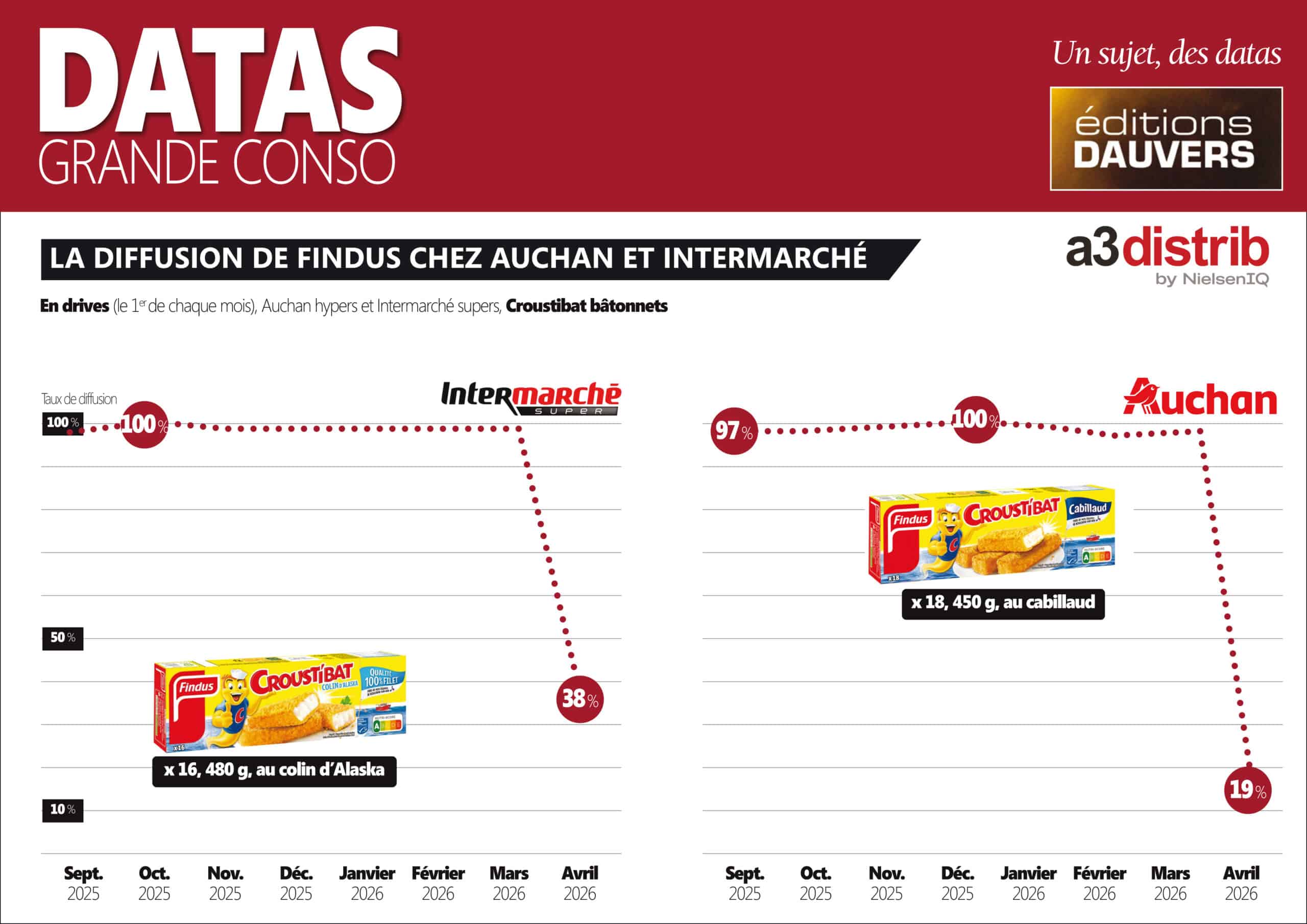 Après Innocent, bouté hors des gondoles par Auchan et Intermarché, je peux révéler une autre marque qui disparaît actuellement des rayons des deux enseignes (qui achètent ensemble, ceci expliquant cela) : Findus. Exemple avec le best-seller Croustibat, habituellement omniprésent avec une DN qui frôle 100 % et désormais en chute libre. Mercredi, le produit n’était plus disponible que dans 38 % des Intermarché et 19 % des Auchan. Et le niveau de DN recule tous les jours, à mesure de l’écoulement des stocks. Hier samedi : 28 % chez Intermarché (– 10 pts en 3 jours) et 16 % chez Auchan (– 3 pts). De bonne source, les négociations sont aussi “difficiles” (ainsi qualifiées chez Intermarché) avec Lesieur ou Red Bull (entre autres).